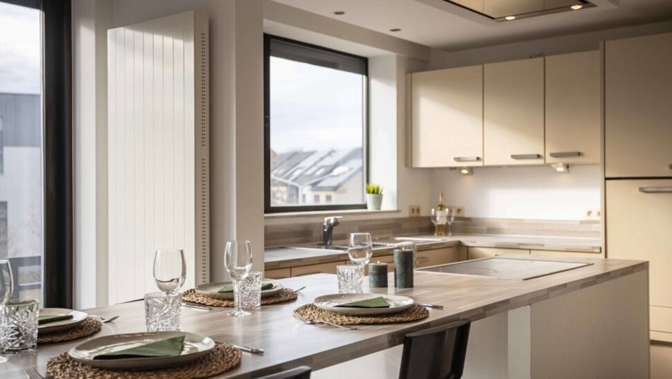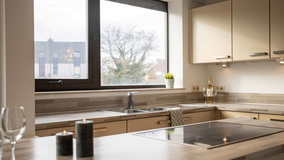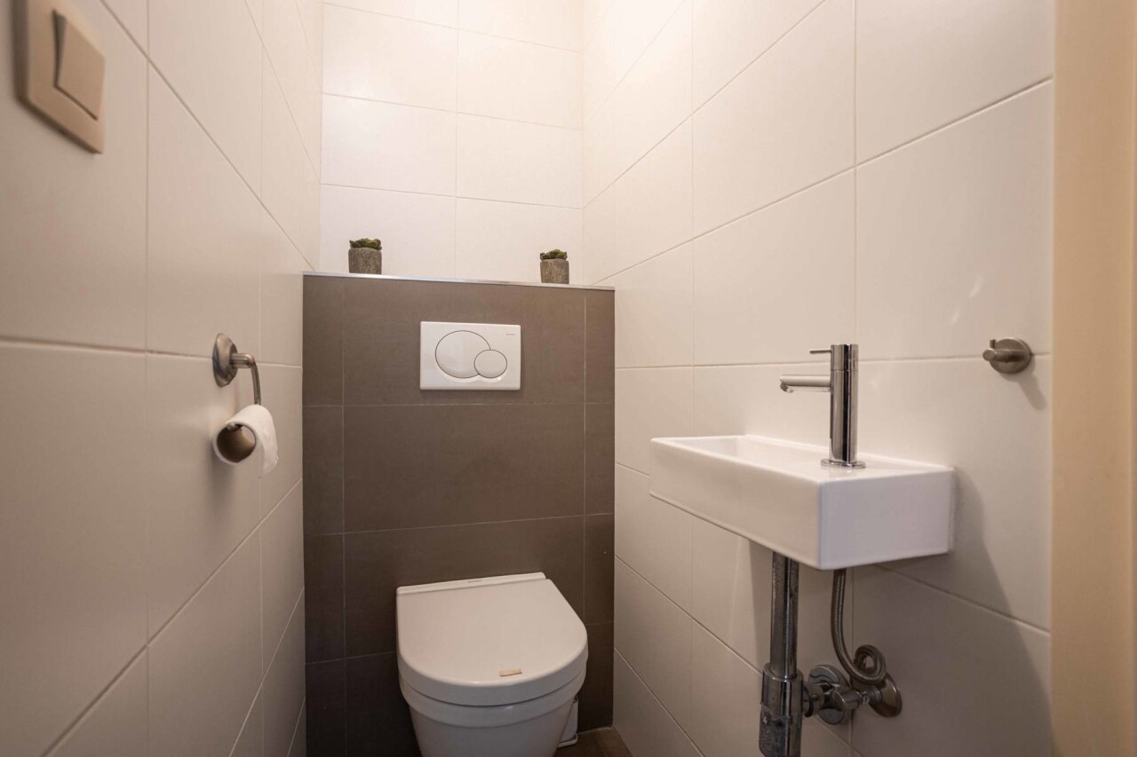 De open, volledig uitgeruste keuken sluit hier naadloos op aan en wordt aangevuld met een praktische, ruime berging. Via de woonkamer bereikt u het zuidgerichte terras (7 m²).