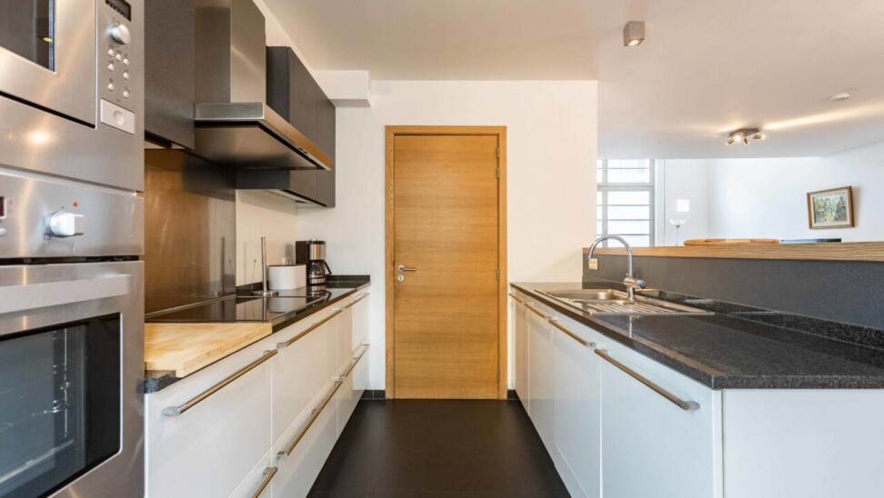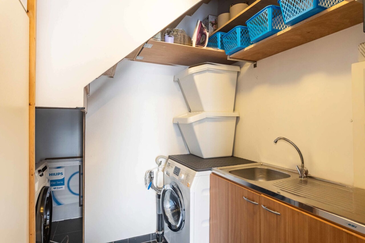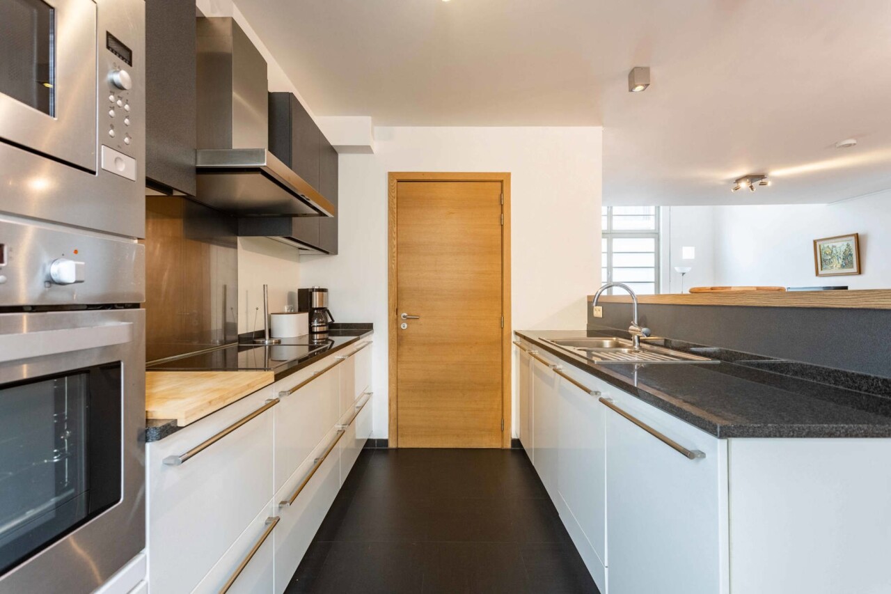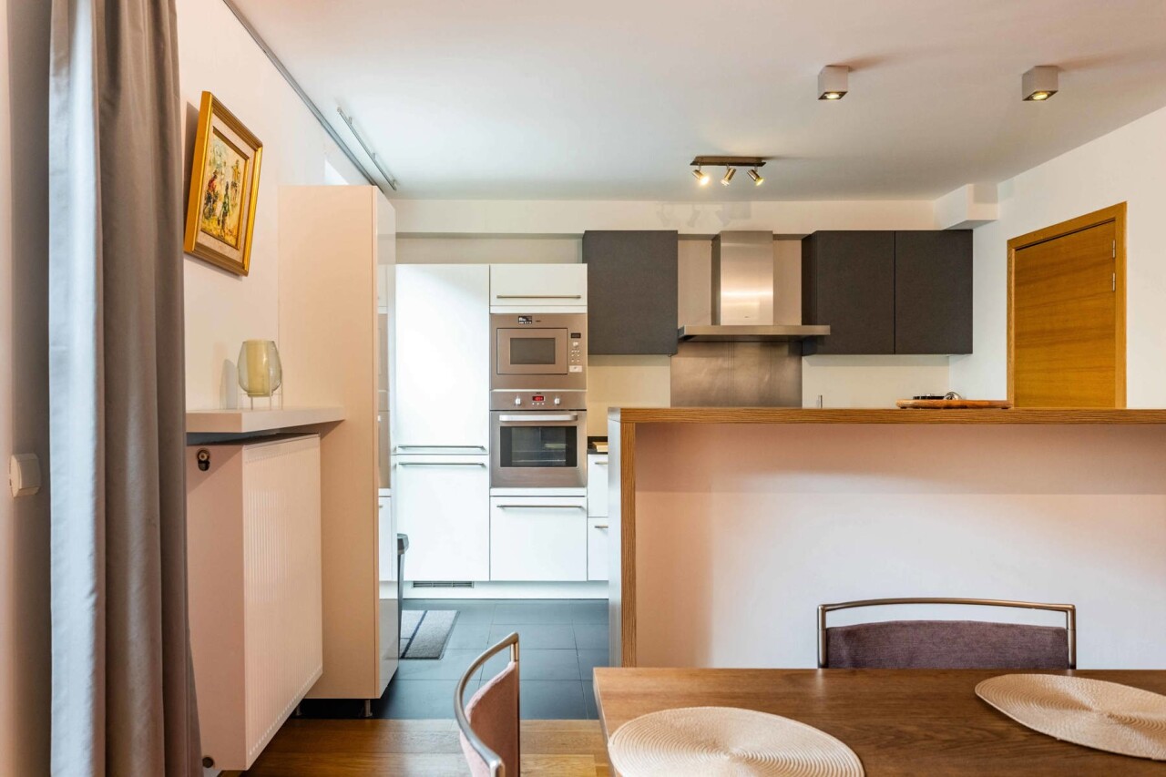 De lichtrijke woon- en eetkamer (41 m²) biedt dankzij de grote raampartijen een aangename leefruimte. Aansluitend bevindt zich de volledig uitgeruste open keuken met aparte bergruimte. Vanuit zowel de keuken als de woonkamer heeft u directe toegang tot het achterliggende terras, waar u in alle rust kan genieten.
