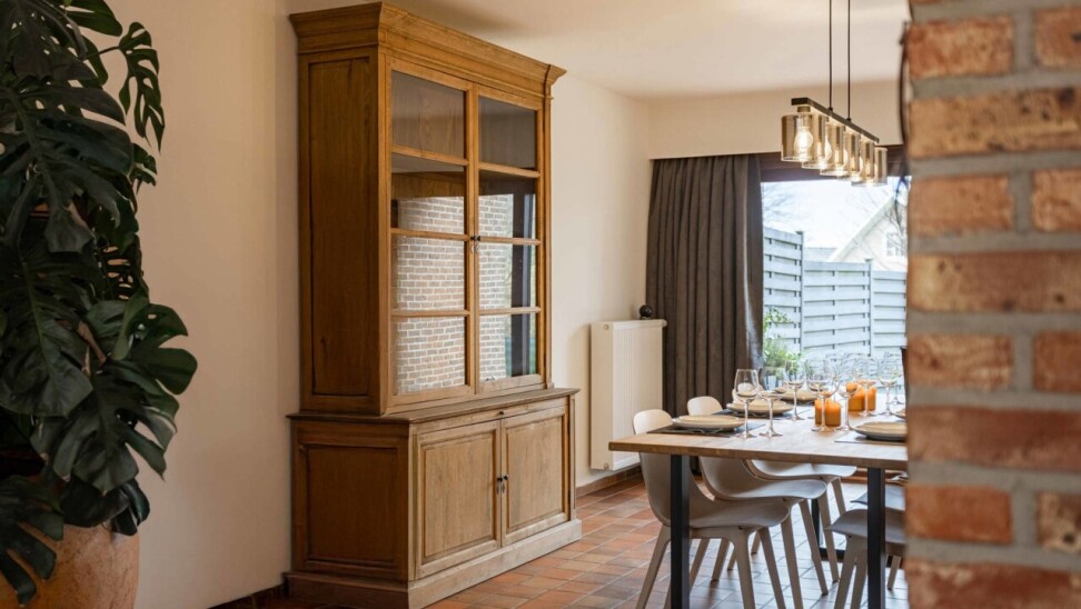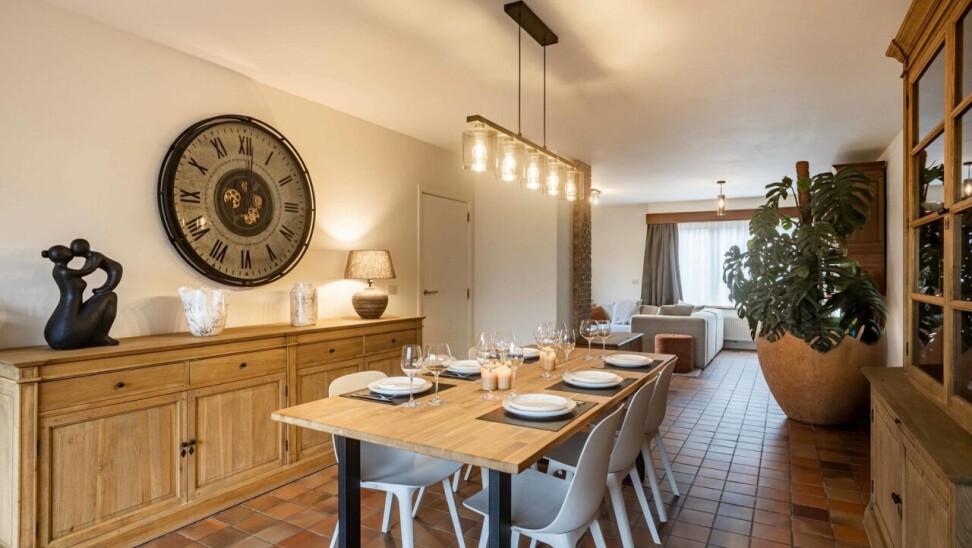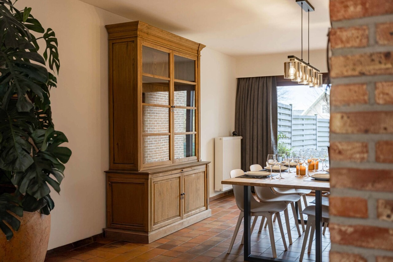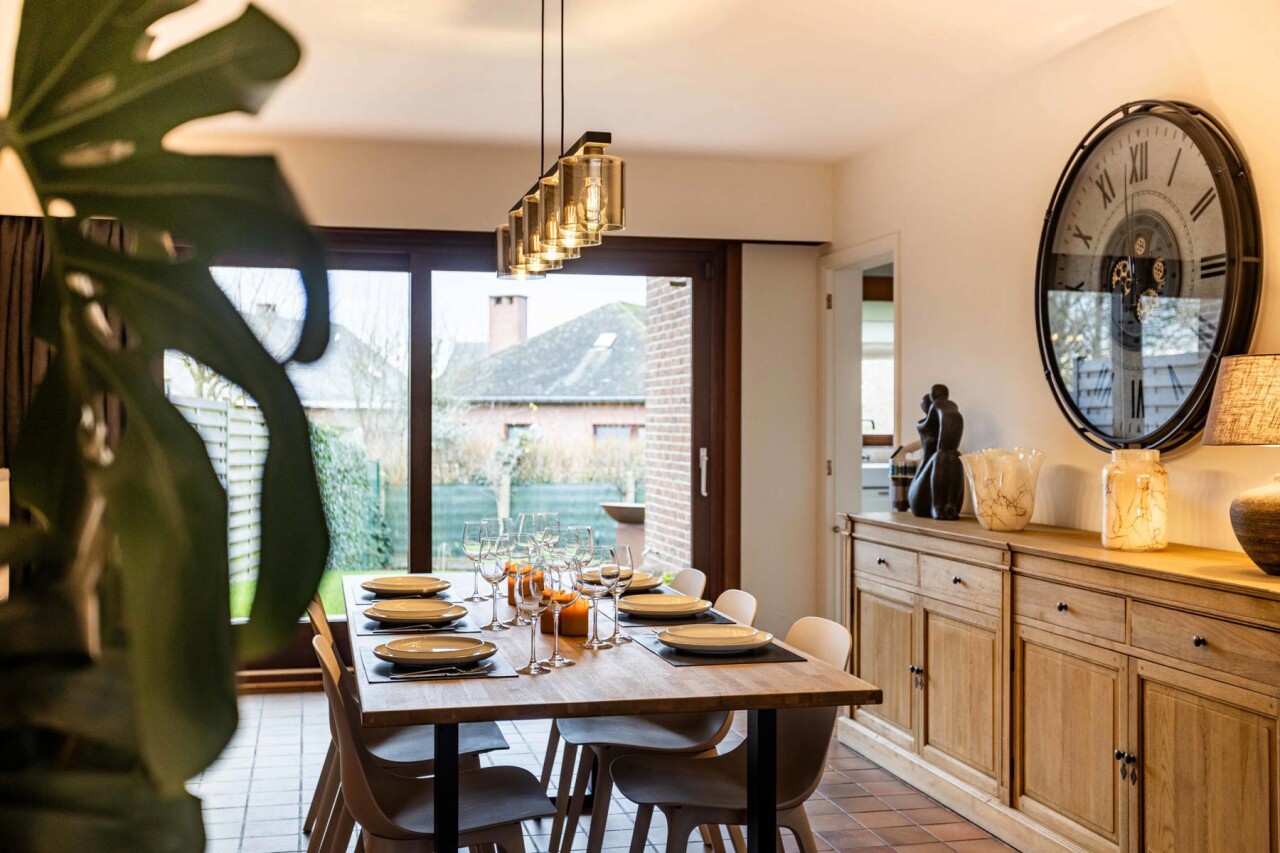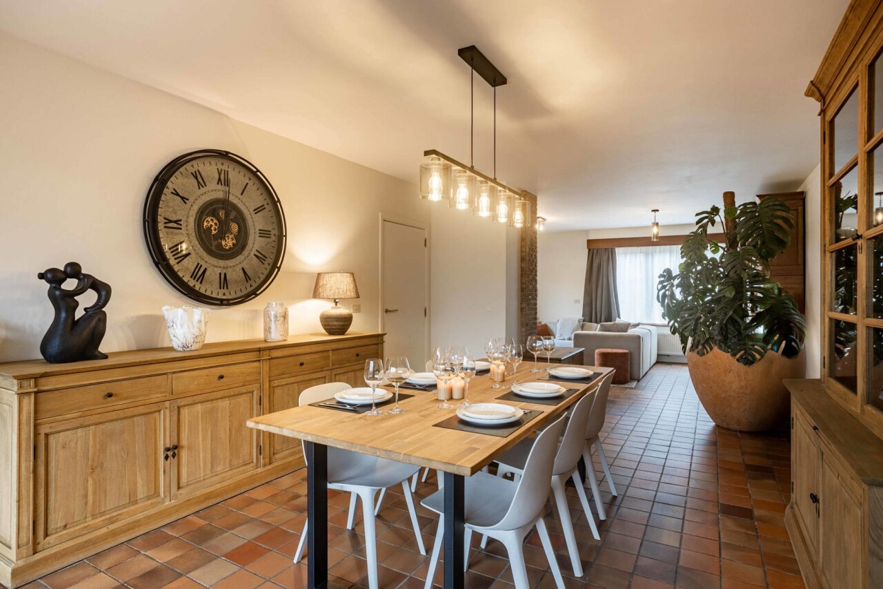 Via de inkomhal met apart gastentoilet betreden we de woning. Deze inkomhal geeft toegang tot de ruime en lichtrijke leef- en eetruimte van 43m², waar grote raampartijen zorgen voor een aangename lichtinval. Aansluitend bevindt zich de volledig gerenoveerde keuken (2022), uitgerust met alle hedendaagse comfort. Zowel de keuken als de eetkamer bieden een mooi zicht op de zuidwestgerichte tuin, ideaal om van de namiddag - en avondzon te genieten.