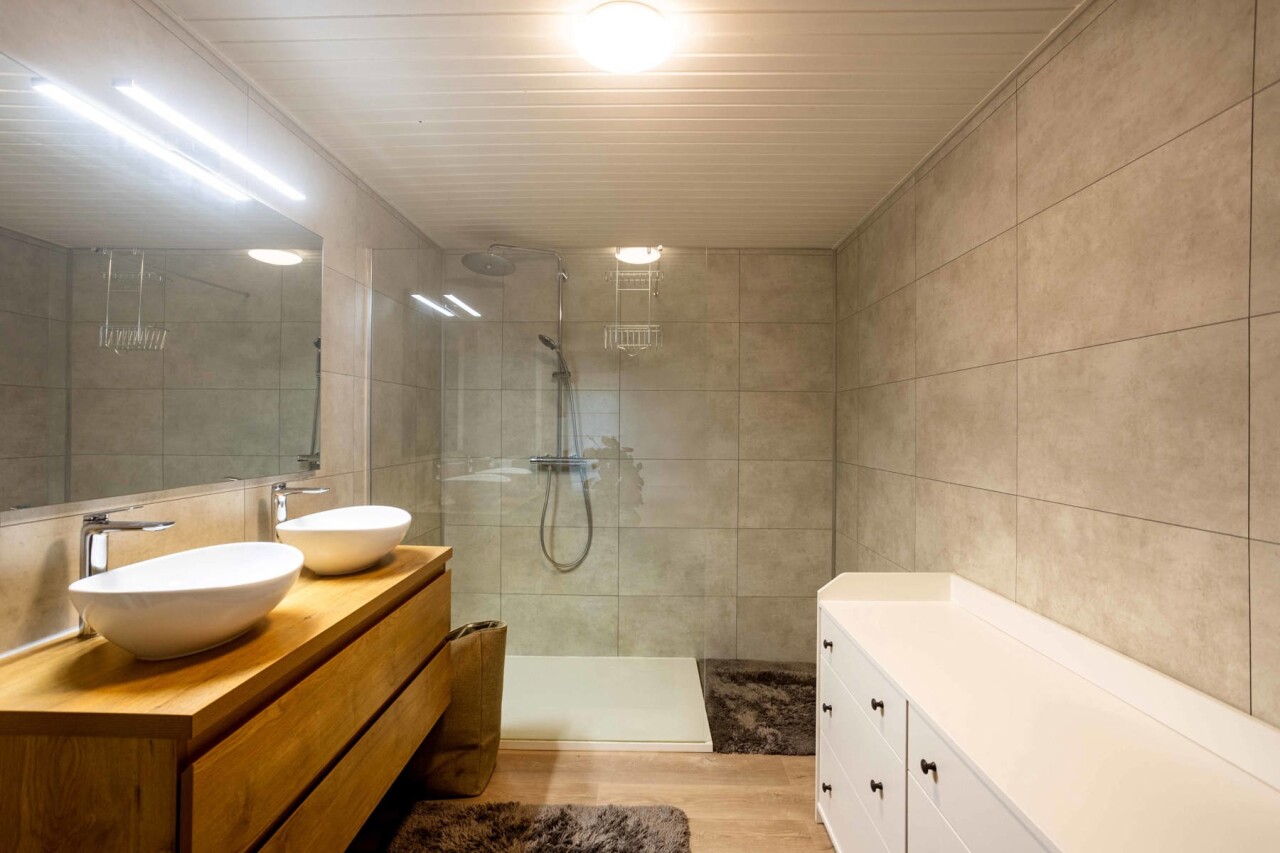 Op het eerste verdiep vinden we drie slaapkamers ( 22-19 en 9m²) en een vernieuwde badkamer met inloopdouche, dubbele lavabo en toilet.
