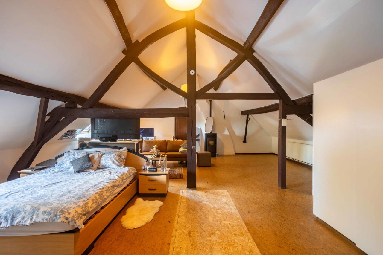 Op het eerste verdiep vinden we de volledige vernieuwde badkamer met douche, ligbad en toilet, 4 slaapkamers ( 12-13-14-26m²) en een grote kamer van bijna 40m². Dewelke perfect ingericht kan worden als een volwaardige studio met aparte ingang.
