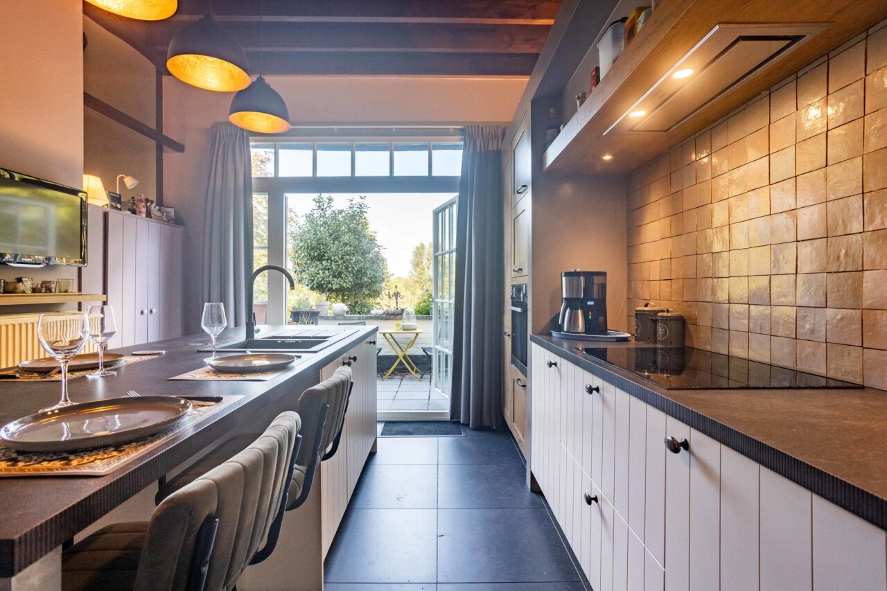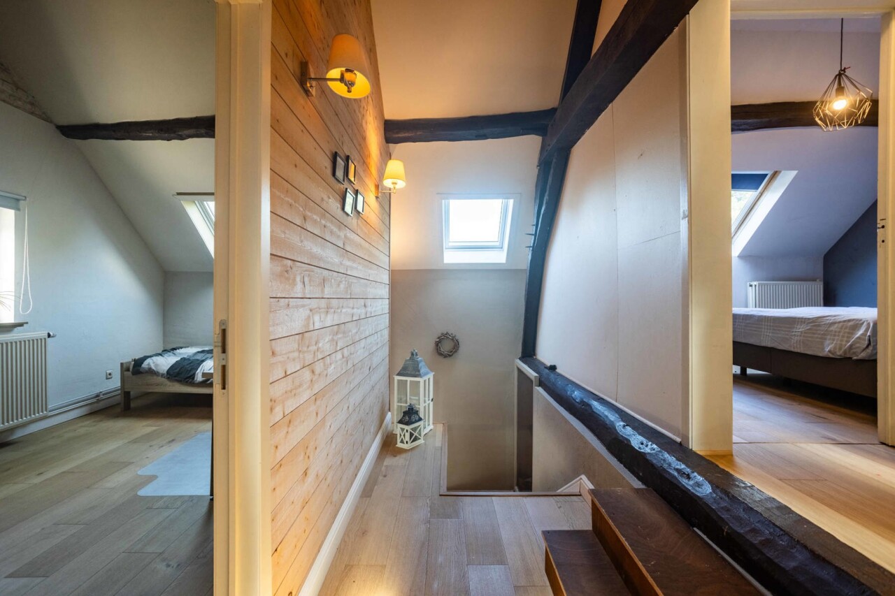 Verder vinden we een prachtige landelijke keuken, volledig uitgerust met alle comfort, die naadloos aansluit op een gezellige woonkamer. Aansluitend ligt een eetkamer en daarnaast een ruime hobbykamer. Het gelijkvloers beschikt bovendien over een sanitaire ruimte en een grote berging/ technische ruimte.