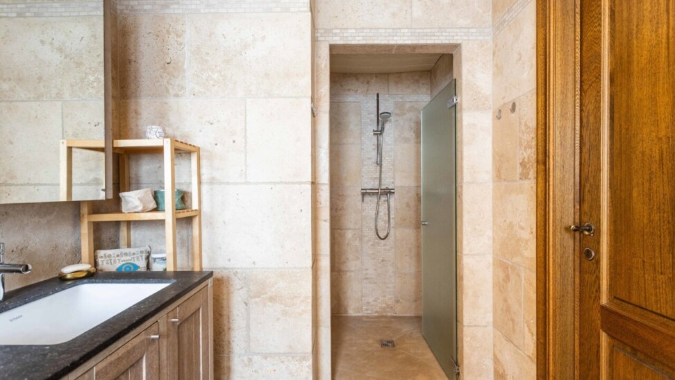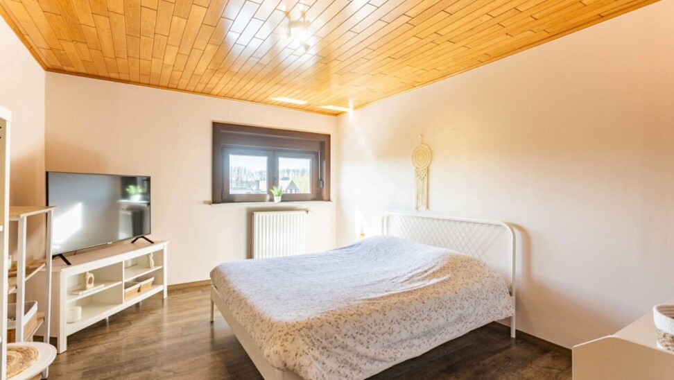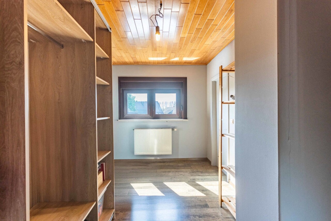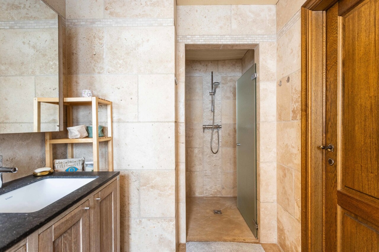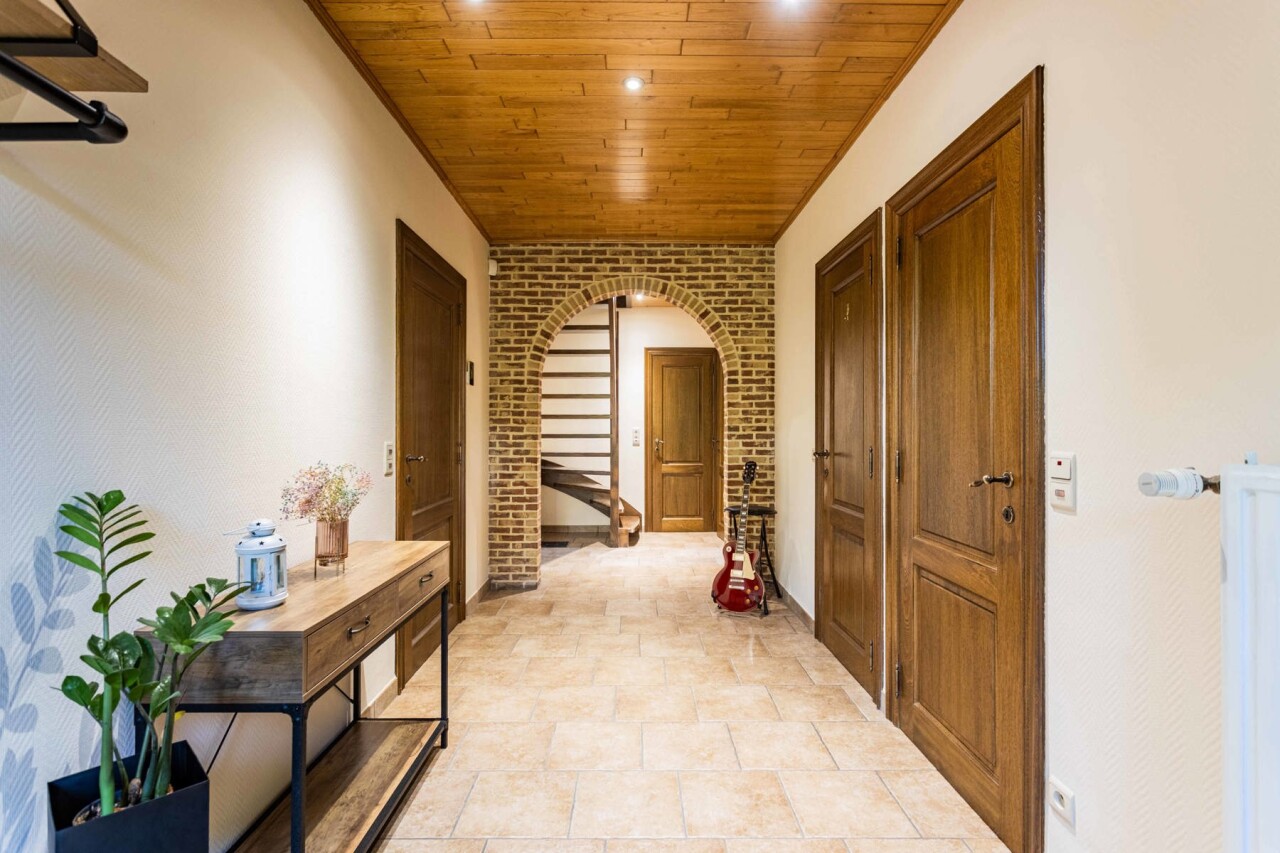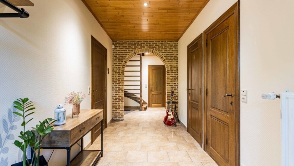 We komen binnen in een grote inkomhal met apart gastentoilet. De inkomhal biedt toegang tot de lichtrijke woonkamer (36m²), een bureauruimte (12m²) met aparte ingang (ideaal voor vrij beroep), een grote slaapkamer (16m²) en een gerenoveerde badkamer met douche en ligbad.