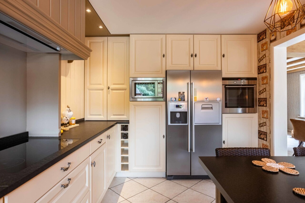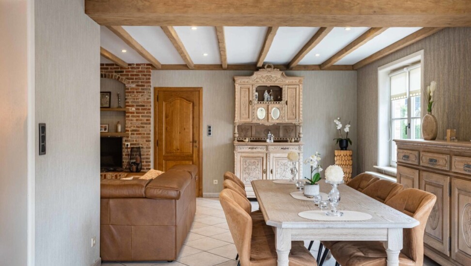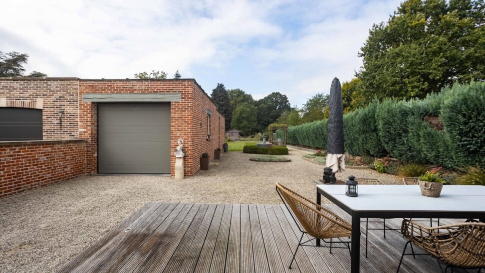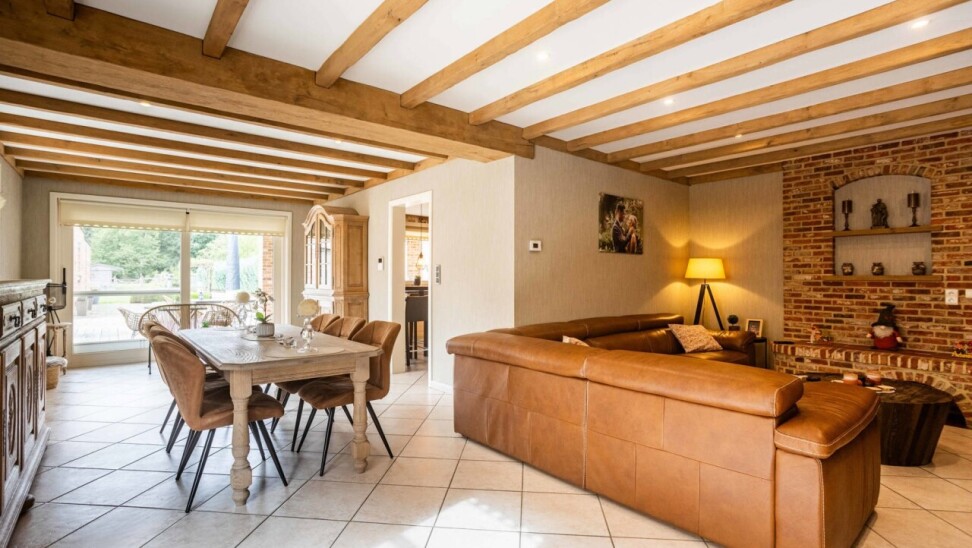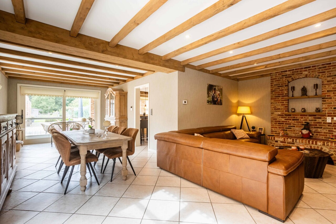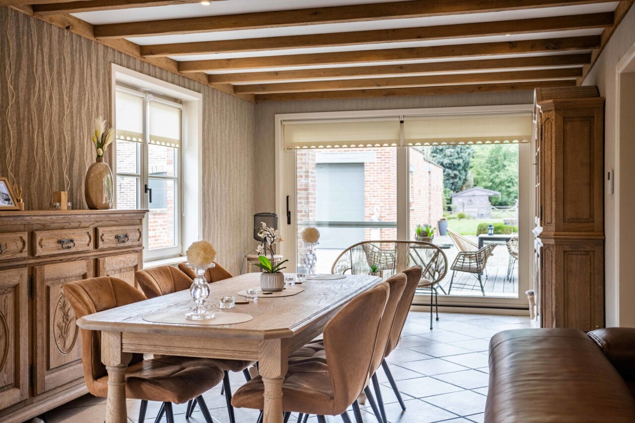 We komen binnen in een ruime, lichtrijke inkomhal met gastentoilet. Vanuit de hal bereiken we de gezellige woon- en eetkamer (44 m²), die aansluit op de volledig uitgeruste keuken (met vaatwas, oven, combi-oven, koelkast, …). Zowel de leefruimte als de keuken genieten van een prachtig zicht op het grote terras en de verzorgde tuin.