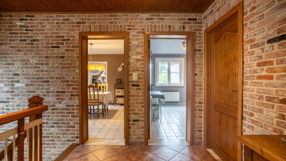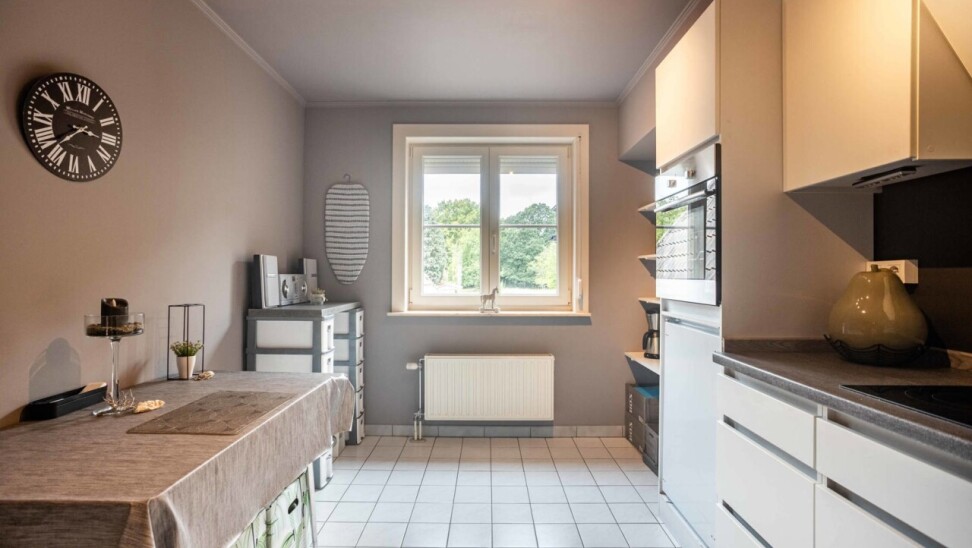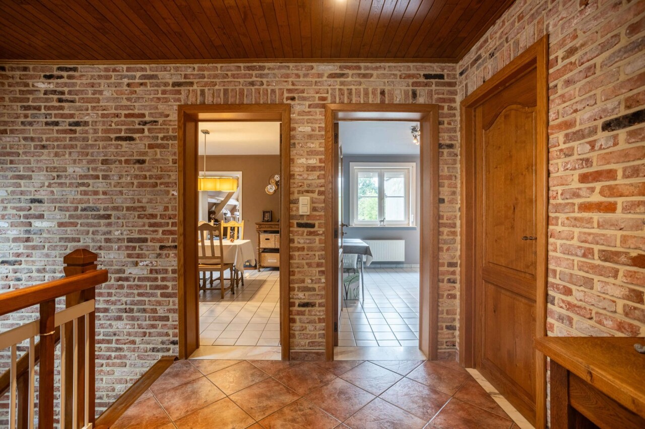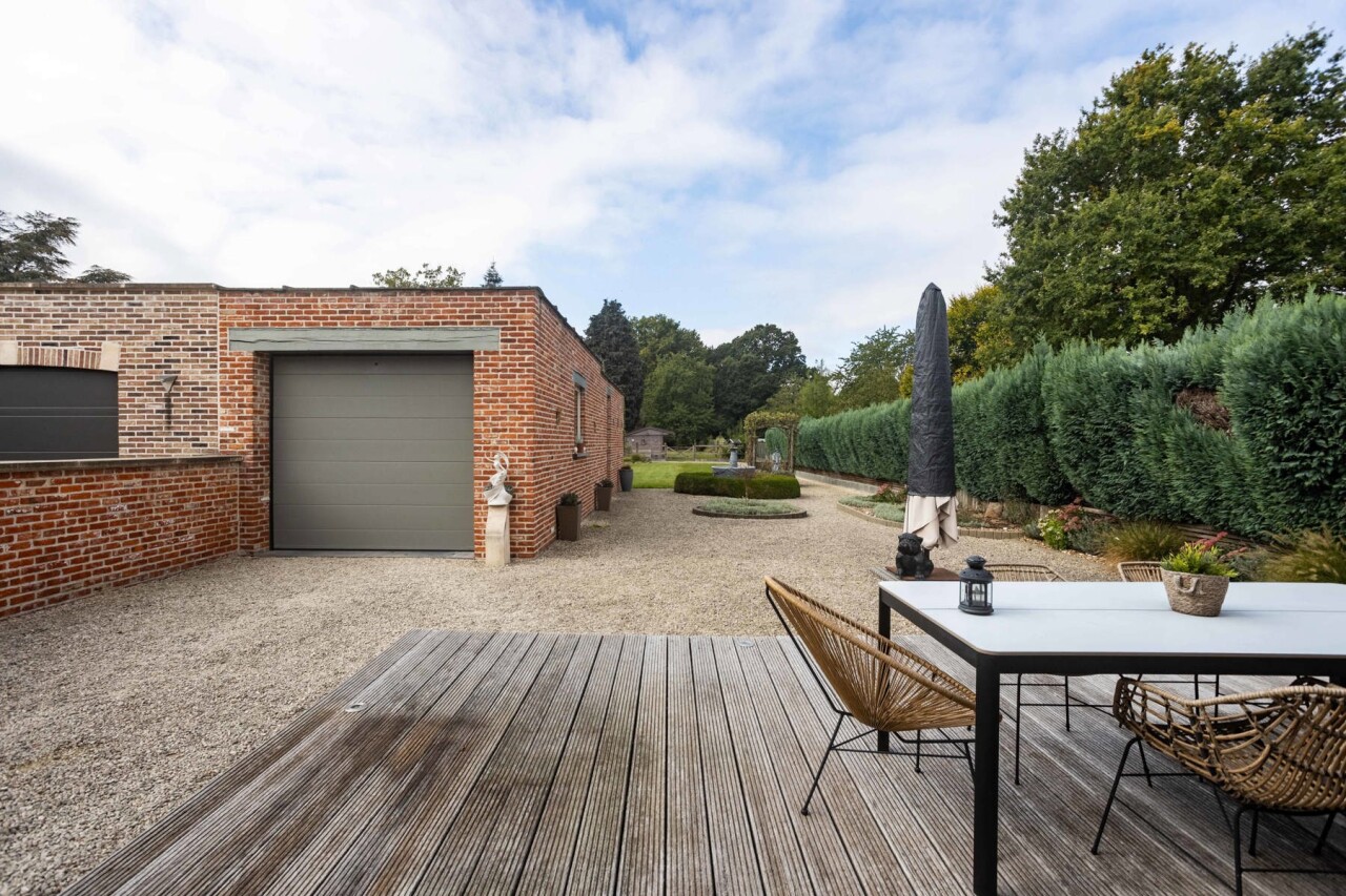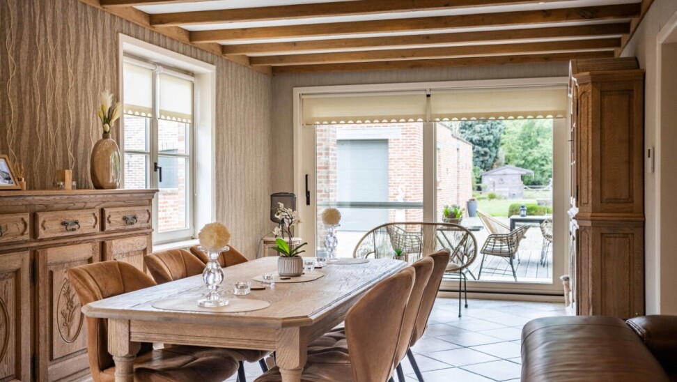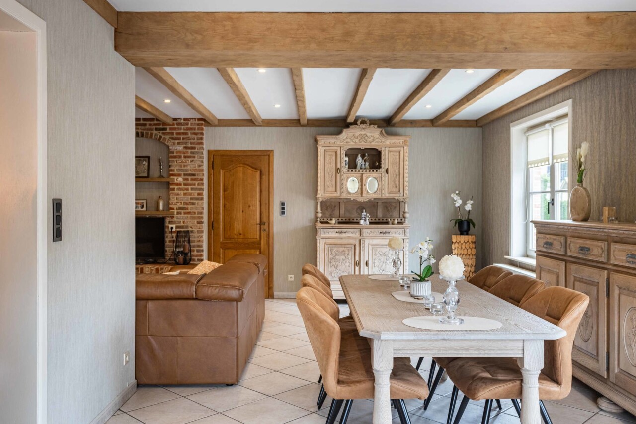 We komen binnen in een ruime, lichtrijke inkomhal met gastentoilet. Vanuit de hal bereiken we de gezellige woon- en eetkamer (44 m²), die aansluit op de volledig uitgeruste keuken (met vaatwas, oven, combi-oven, koelkast, …). Zowel de leefruimte als de keuken genieten van een prachtig zicht op het grote terras en de verzorgde tuin.