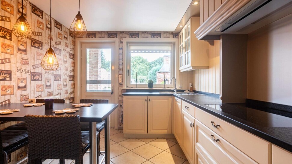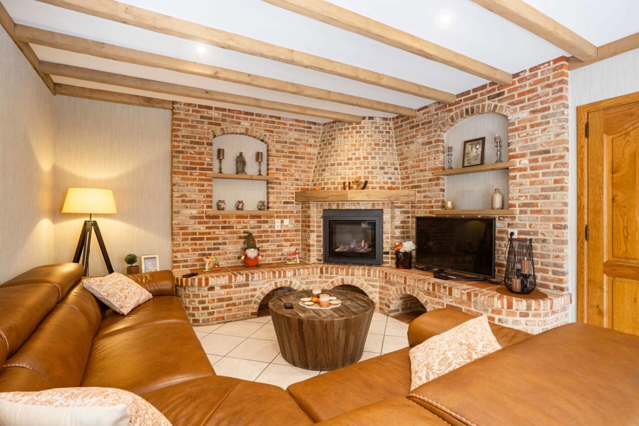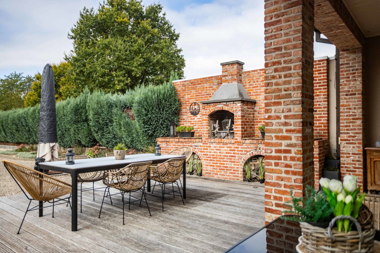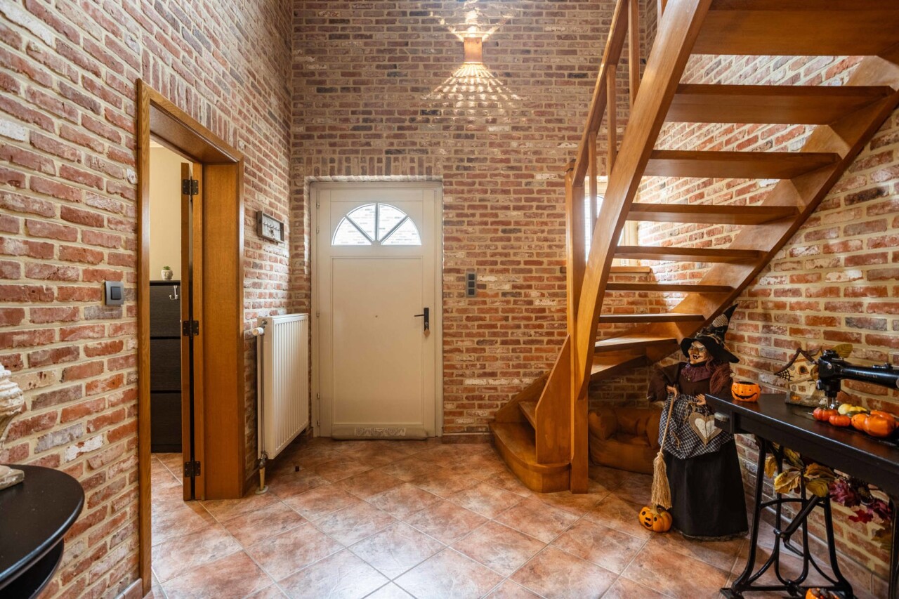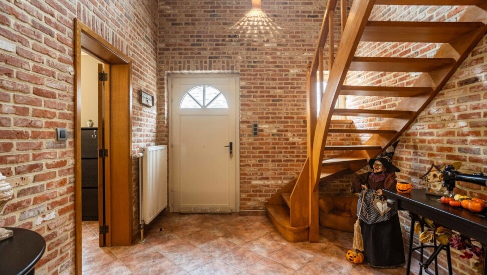 We komen binnen in een ruime, lichtrijke inkomhal met gastentoilet. Vanuit de hal bereiken we de gezellige woon- en eetkamer (44 m²), die aansluit op de volledig uitgeruste keuken (met vaatwas, oven, combi-oven, koelkast, …). Zowel de leefruimte als de keuken genieten van een prachtig zicht op het grote terras en de verzorgde tuin.