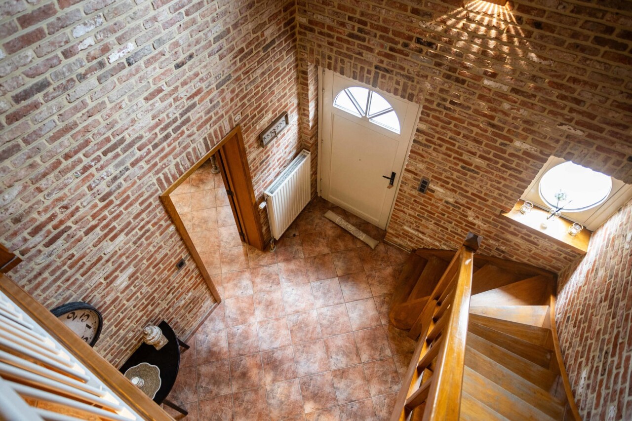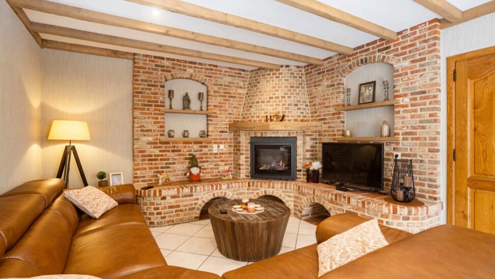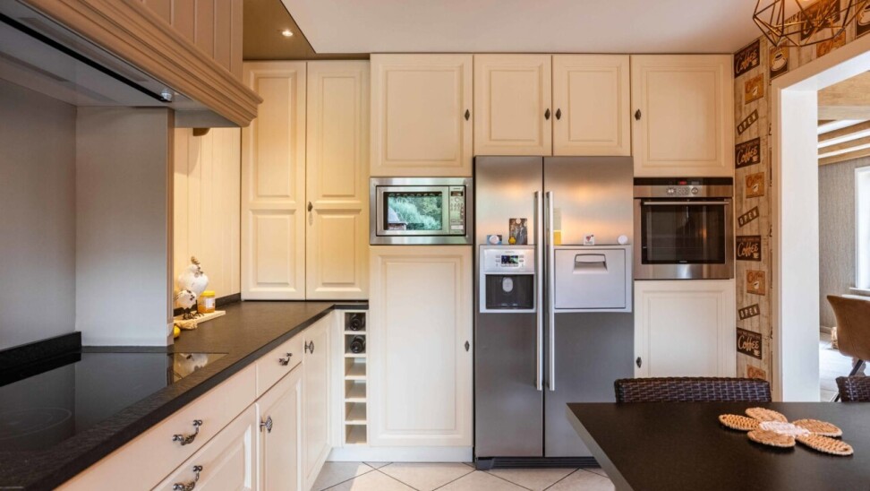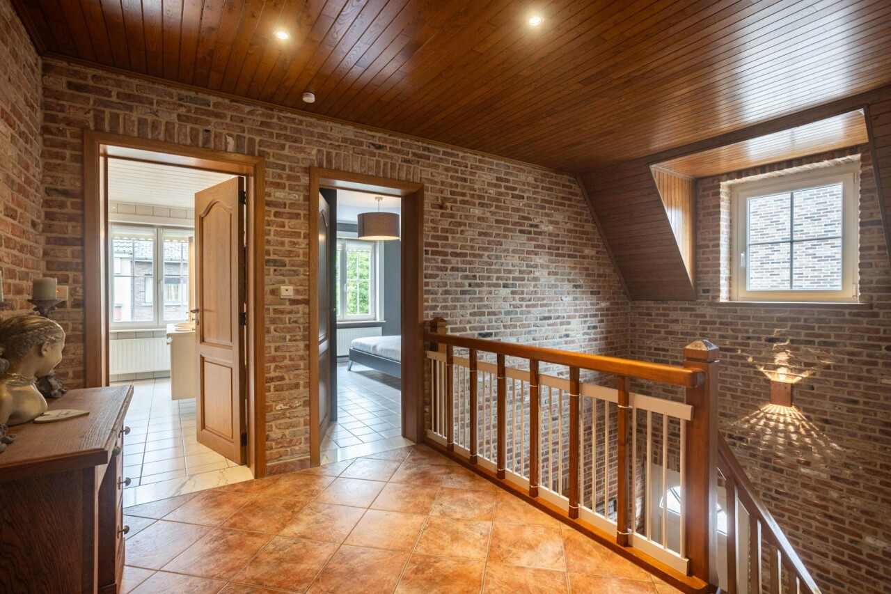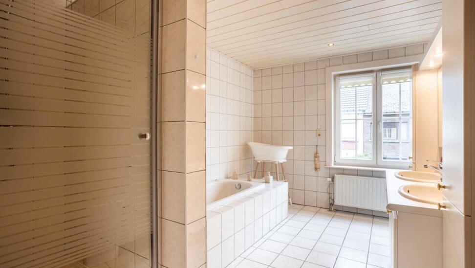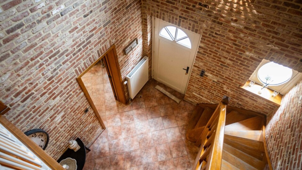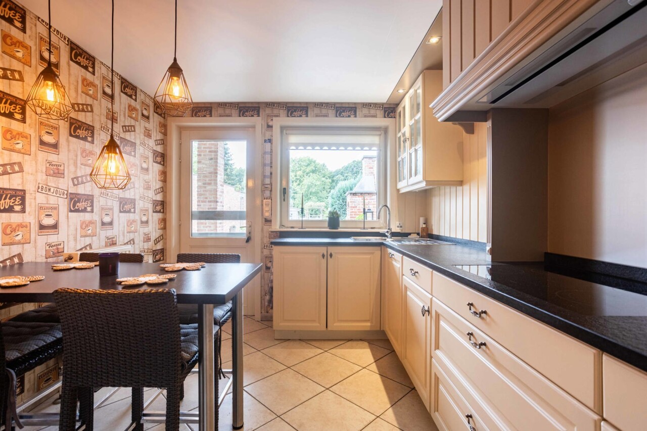 We komen binnen in een ruime, lichtrijke inkomhal met gastentoilet. Vanuit de hal bereiken we de gezellige woon- en eetkamer (44 m²), die aansluit op de volledig uitgeruste keuken (met vaatwas, oven, combi-oven, koelkast, …). Zowel de leefruimte als de keuken genieten van een prachtig zicht op het grote terras en de verzorgde tuin.