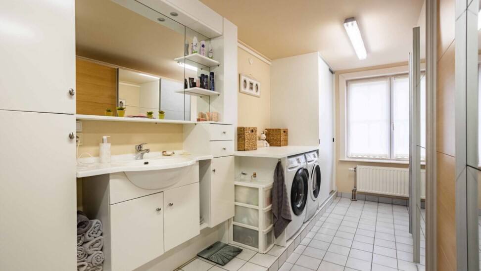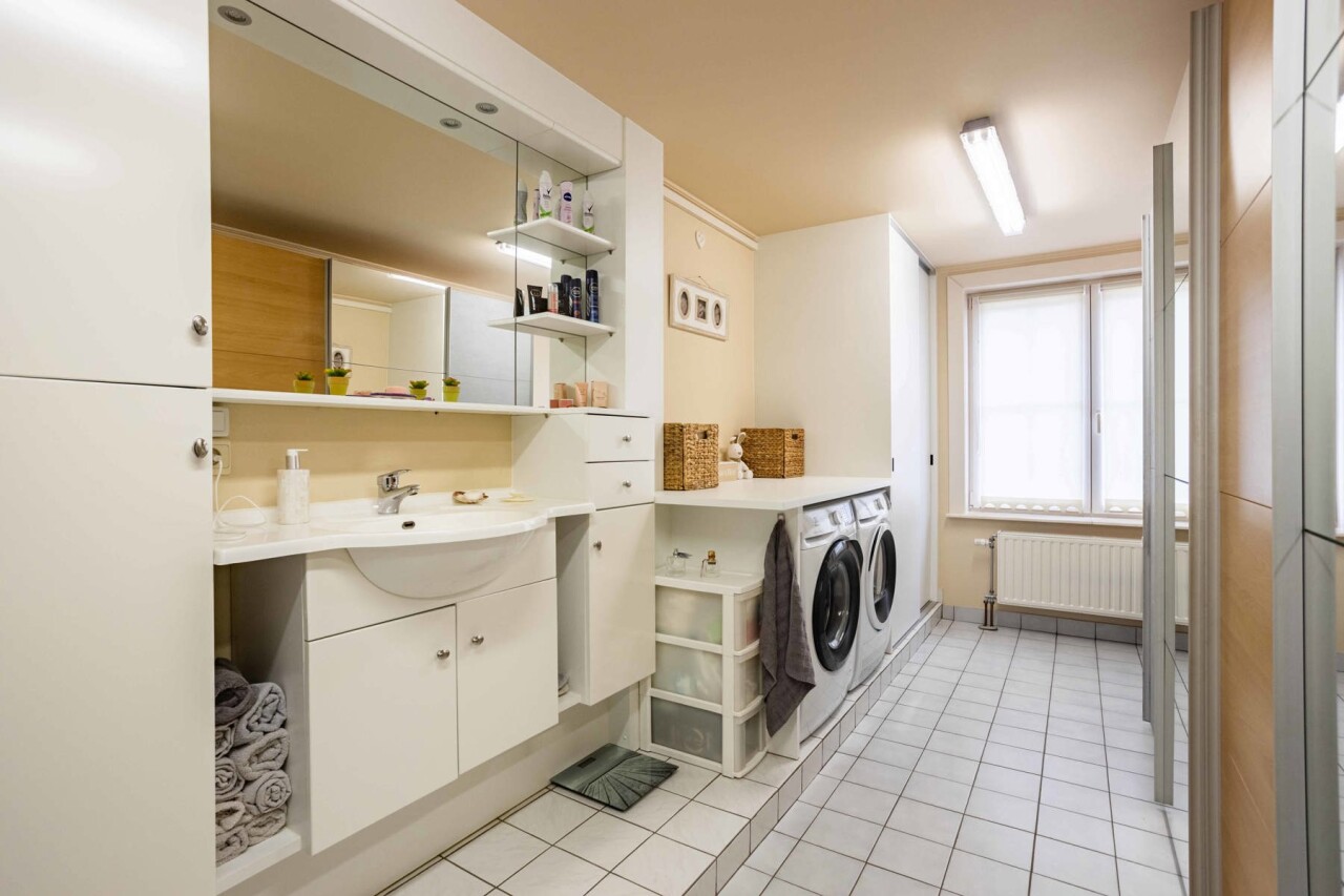 Verder vinden we op het gelijkvloers nog een ruime slaapkamer (16,5 m²) en een wasruimte/extra badkamer.