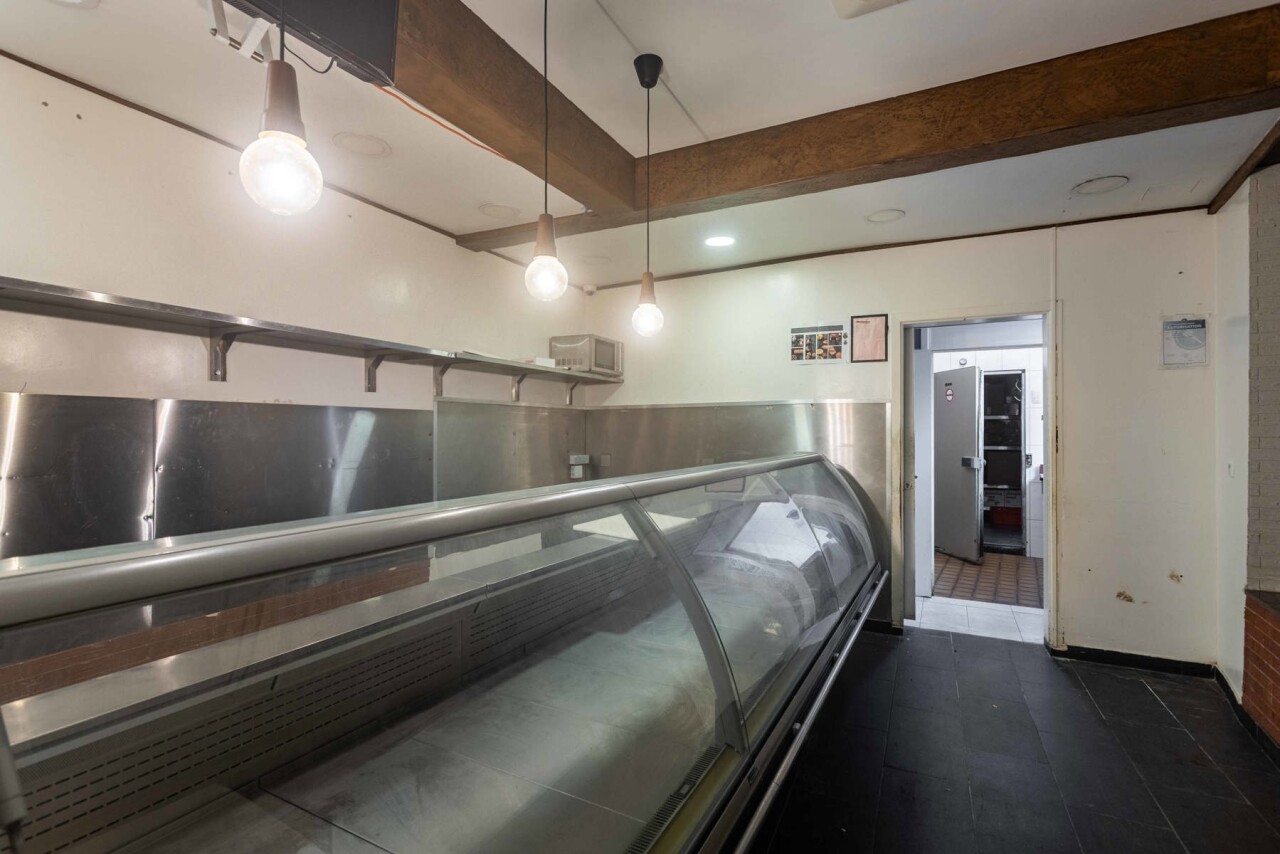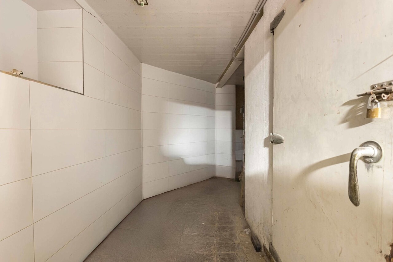 Op het gelijkvloers en in de kelderverdieping bevindt zich de handelsruimte (90m²), die momenteel verhuurd is en wordt gebruikt als beenhouwerij, atelier en opslagruimte.