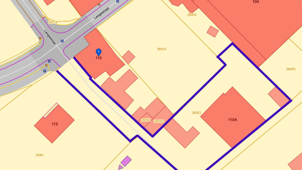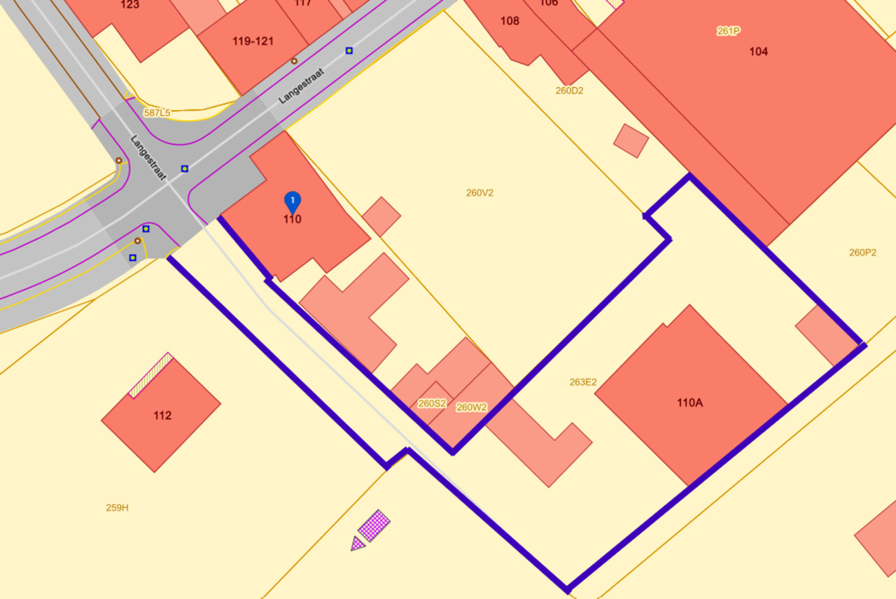Het perceel beschikt over een brede toegangsweg van 10 meter via de Langestraat en een lange oprijlaan tot op het terrein zelf.