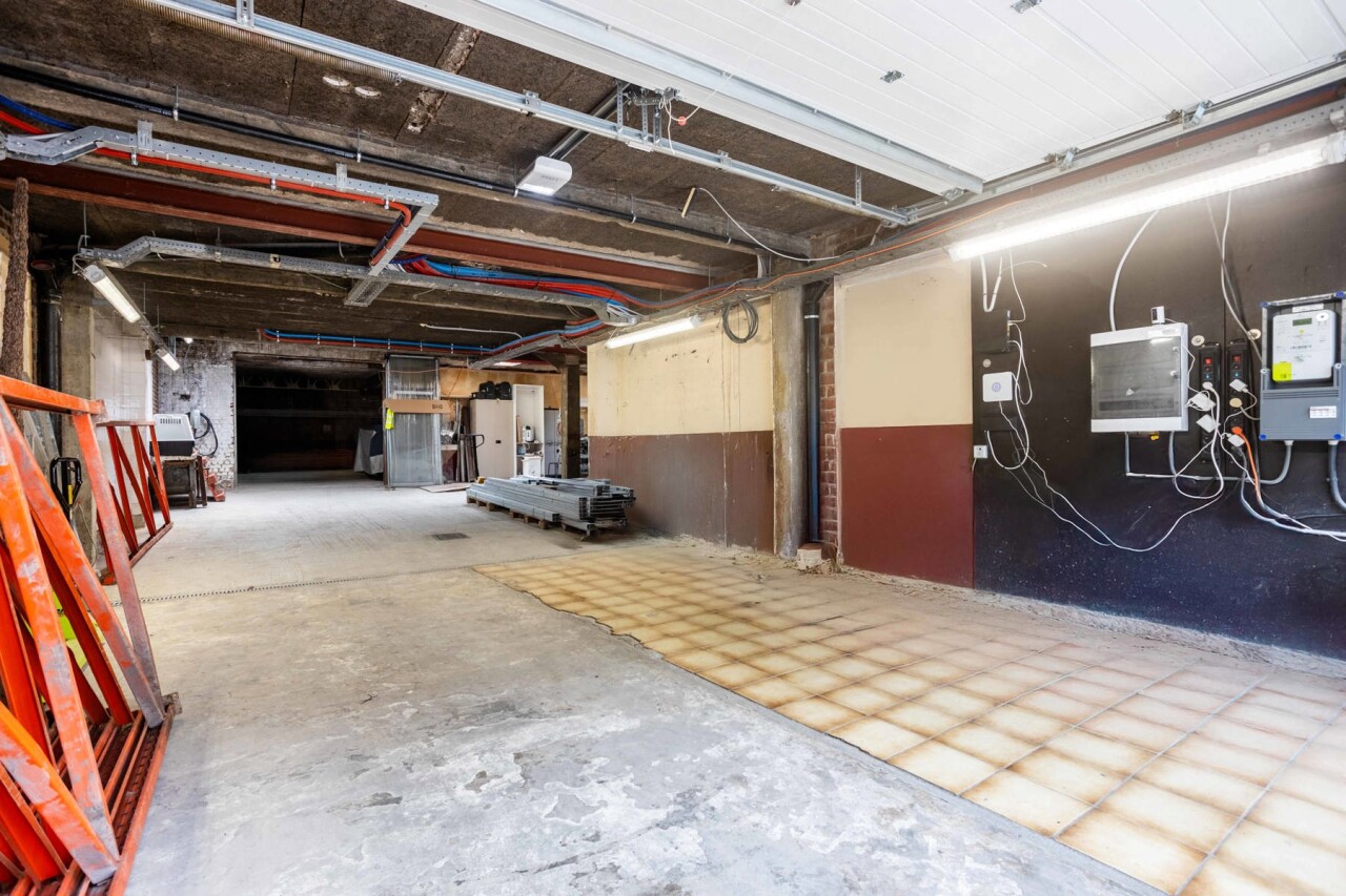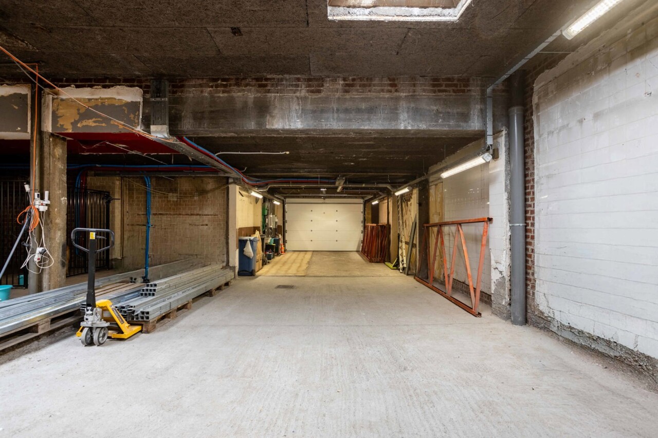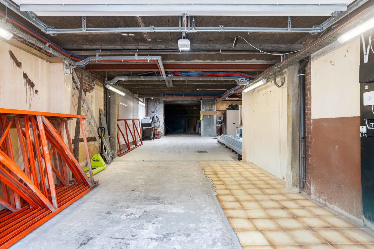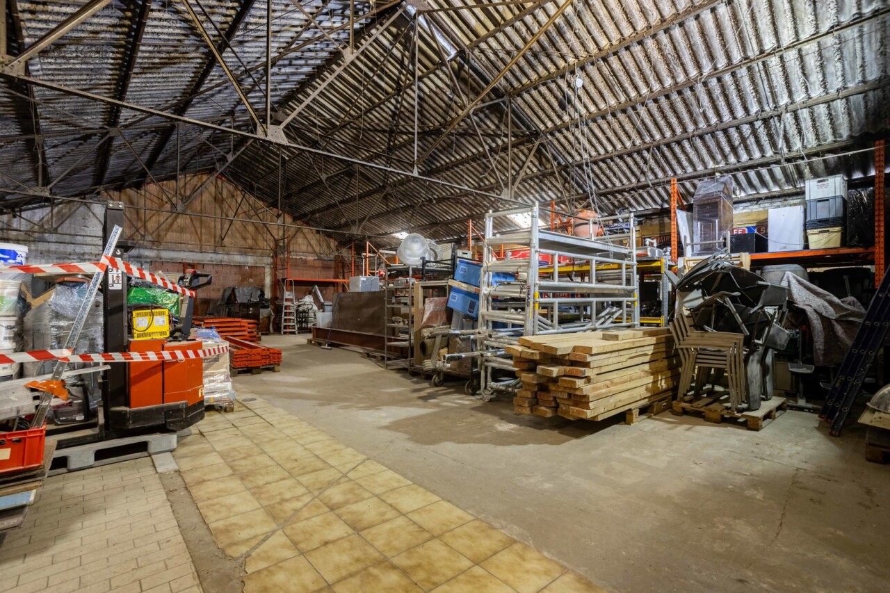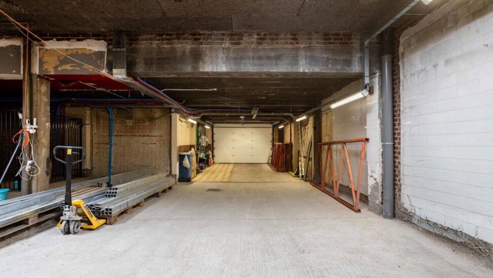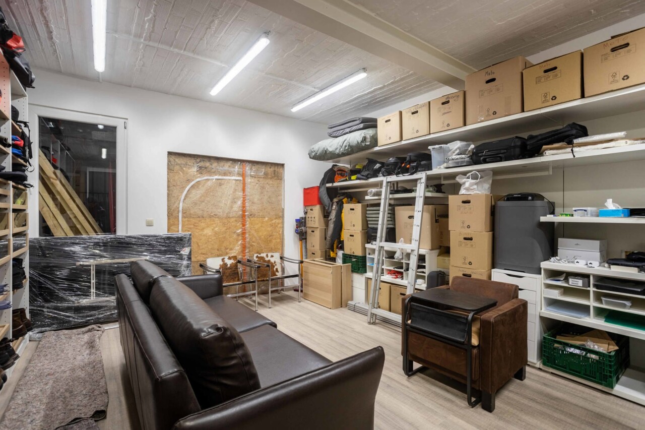 Via de sectionaal poort met een hoogte van 2,55 meter heeft men toegang tot het voorste gedeelte van de opslagruimte. Dit gedeelte omvat een aparte kantoorruimte, technische ruimte en heel wat vrije ruimte, om bijvoorbeeld wagens te parkeren. Daarnaast bevindt zich nog een grote, open loods. Momenteel benut als éen geheel, maar het is perfect mogelijk om hier verschillende compartimenten te voorzien.