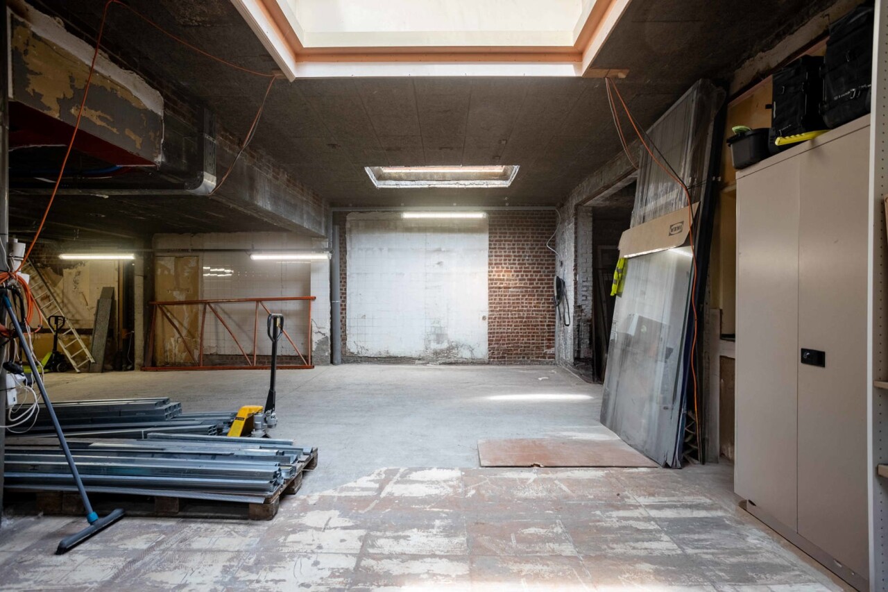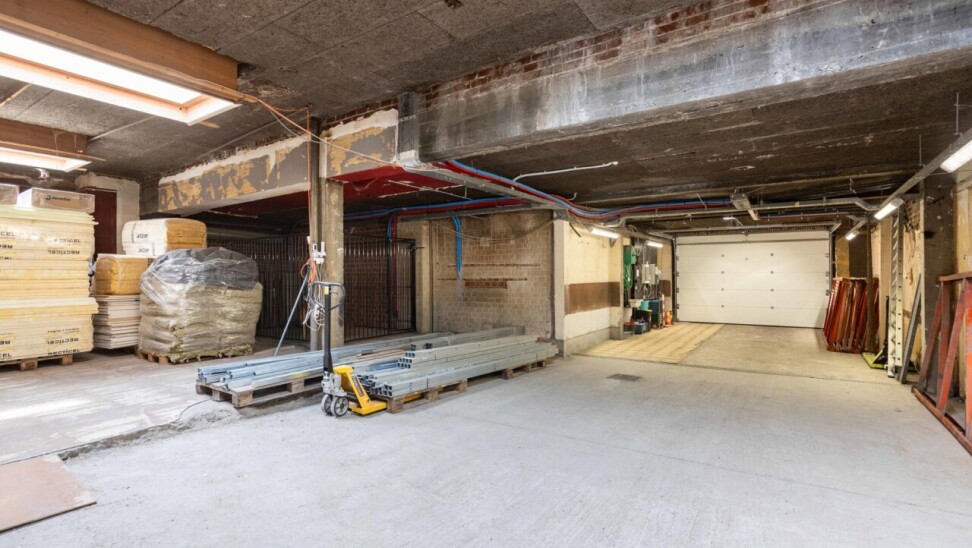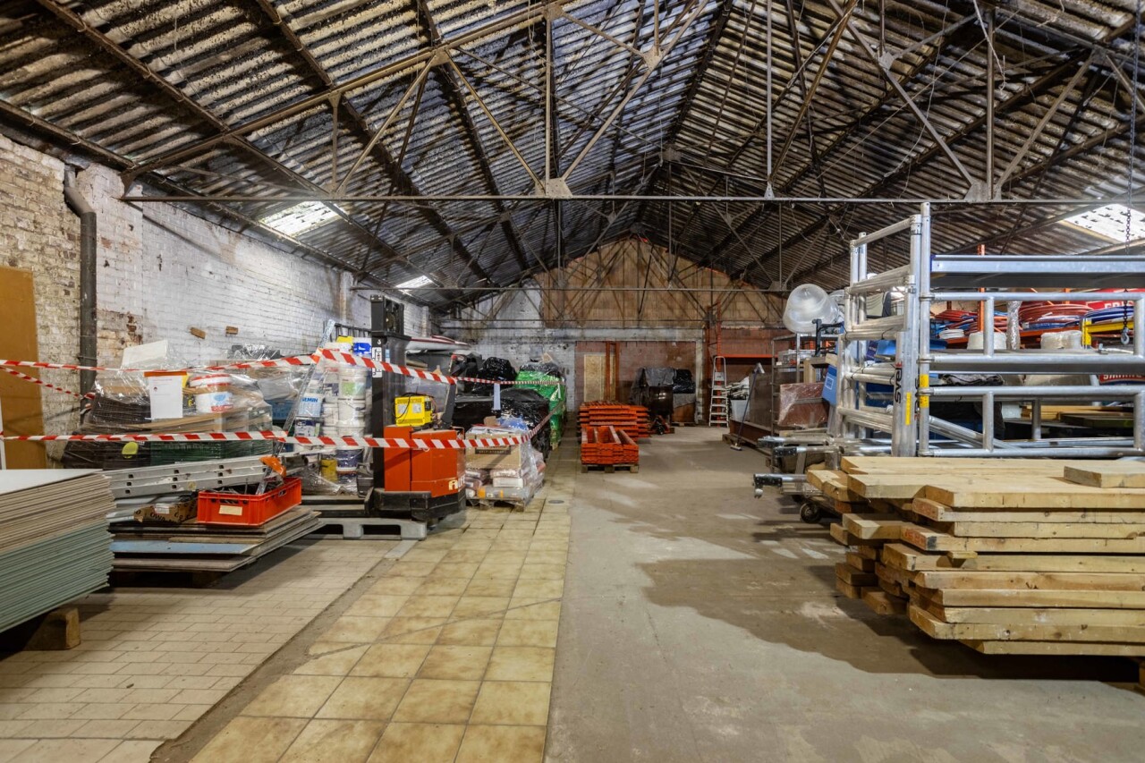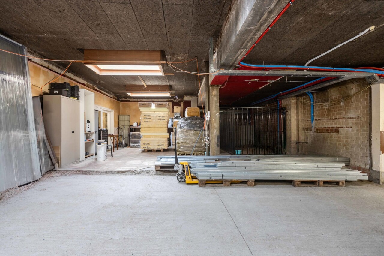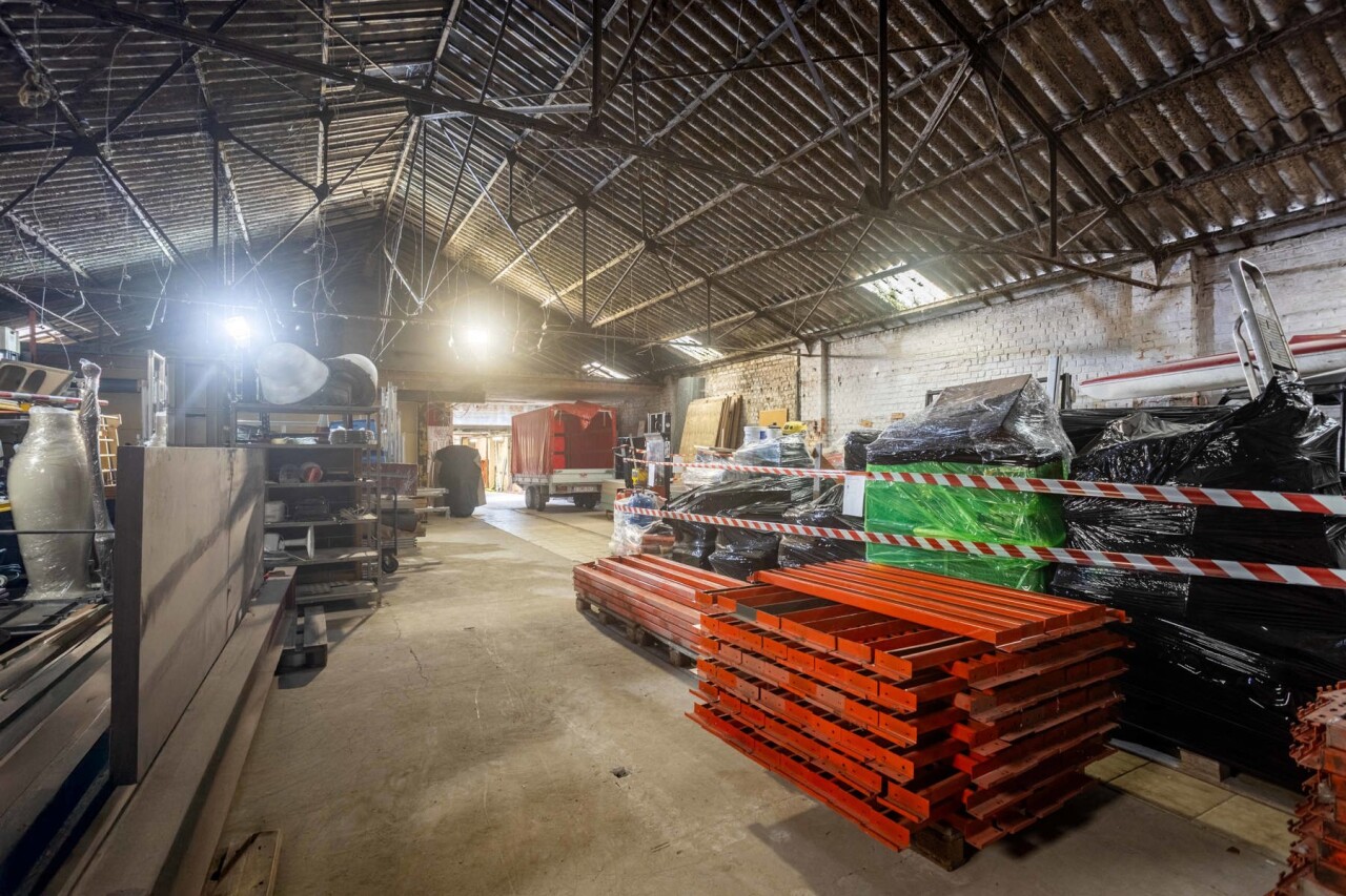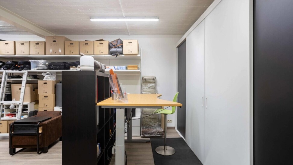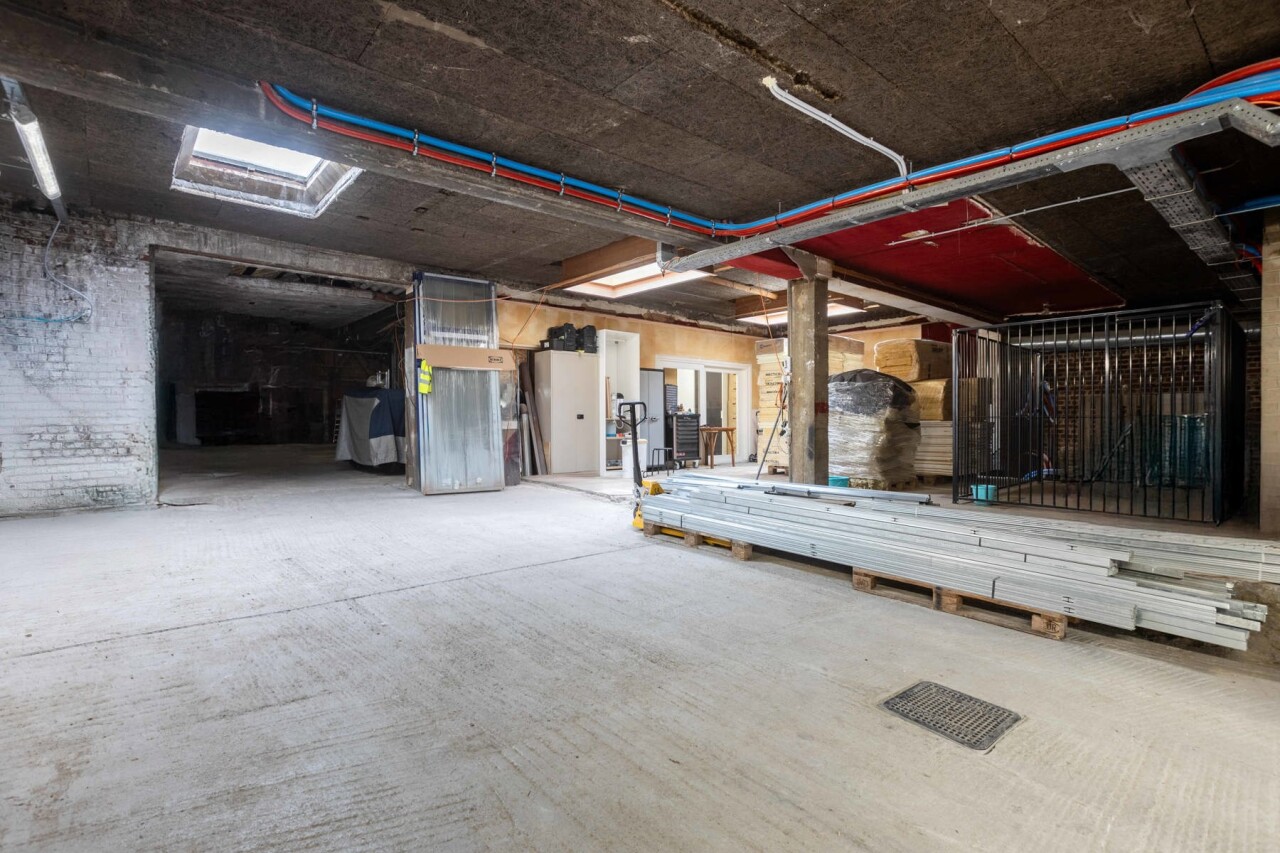 Via de sectionaal poort met een hoogte van 2,55 meter heeft men toegang tot het voorste gedeelte van de opslagruimte. Dit gedeelte omvat een aparte kantoorruimte, technische ruimte en heel wat vrije ruimte, om bijvoorbeeld wagens te parkeren. Daarnaast bevindt zich nog een grote, open loods. Momenteel benut als éen geheel, maar het is perfect mogelijk om hier verschillende compartimenten te voorzien.