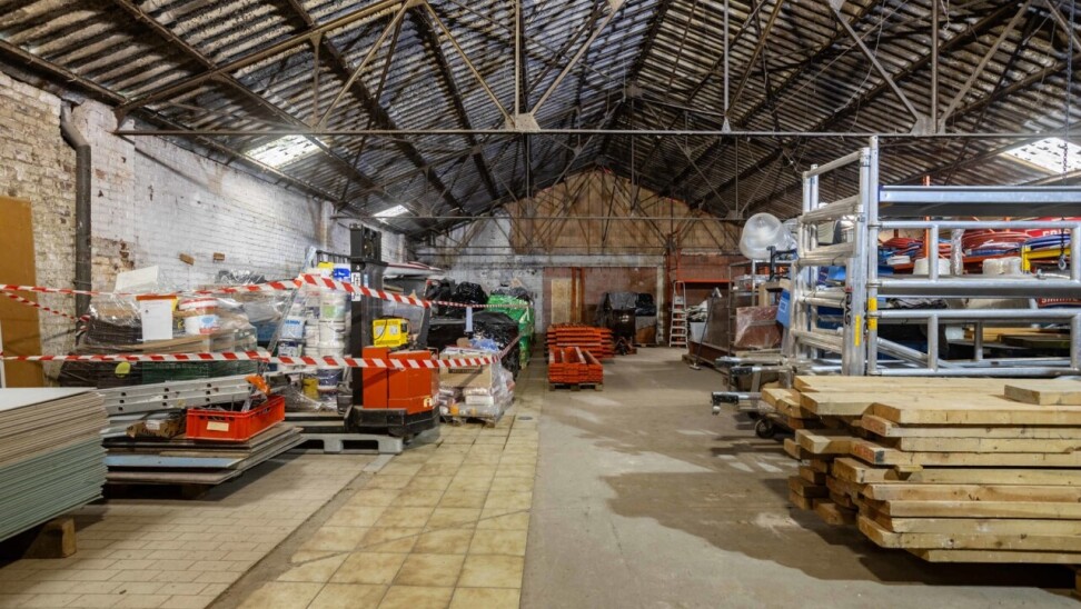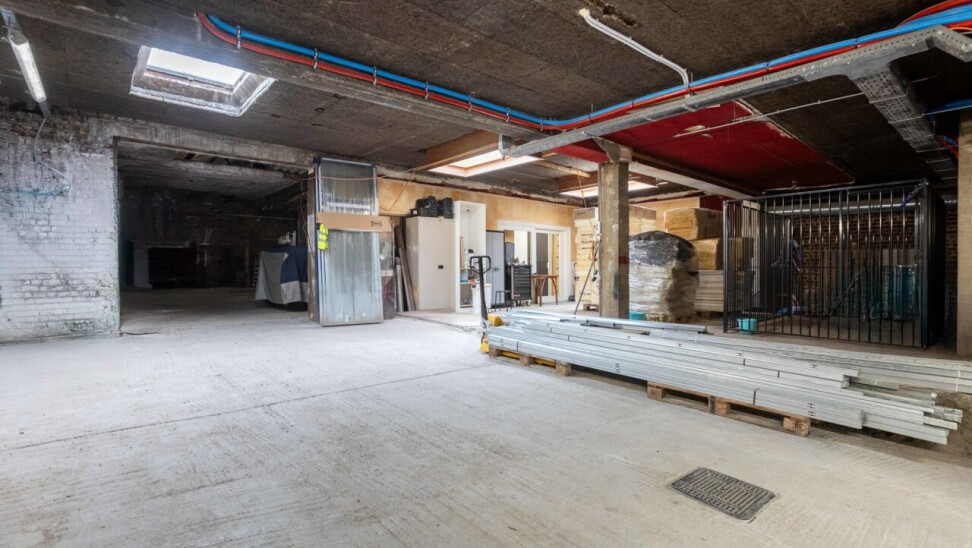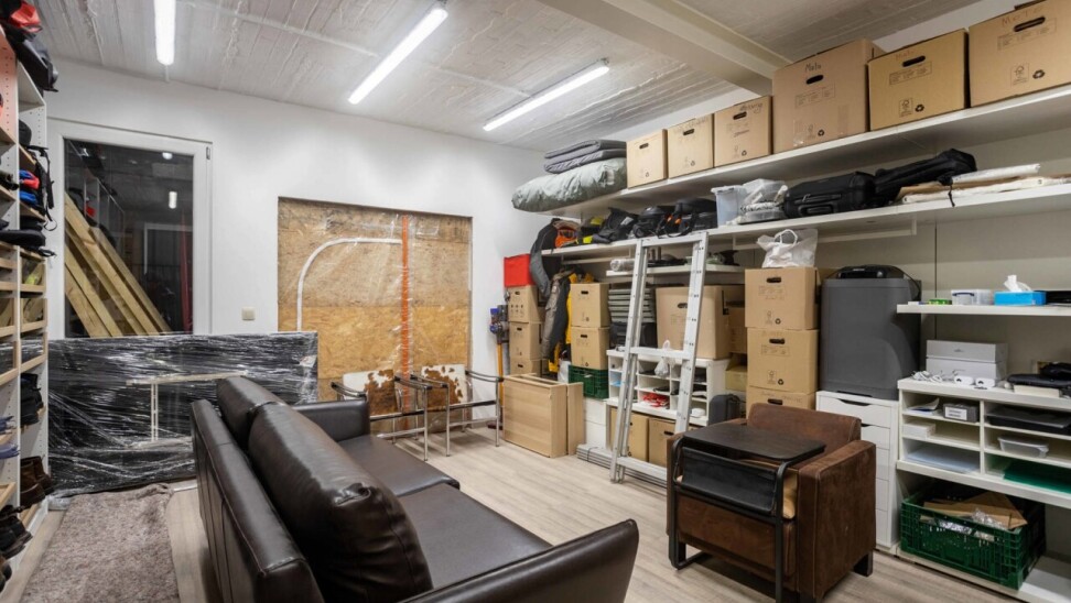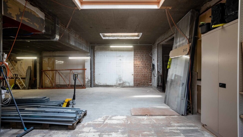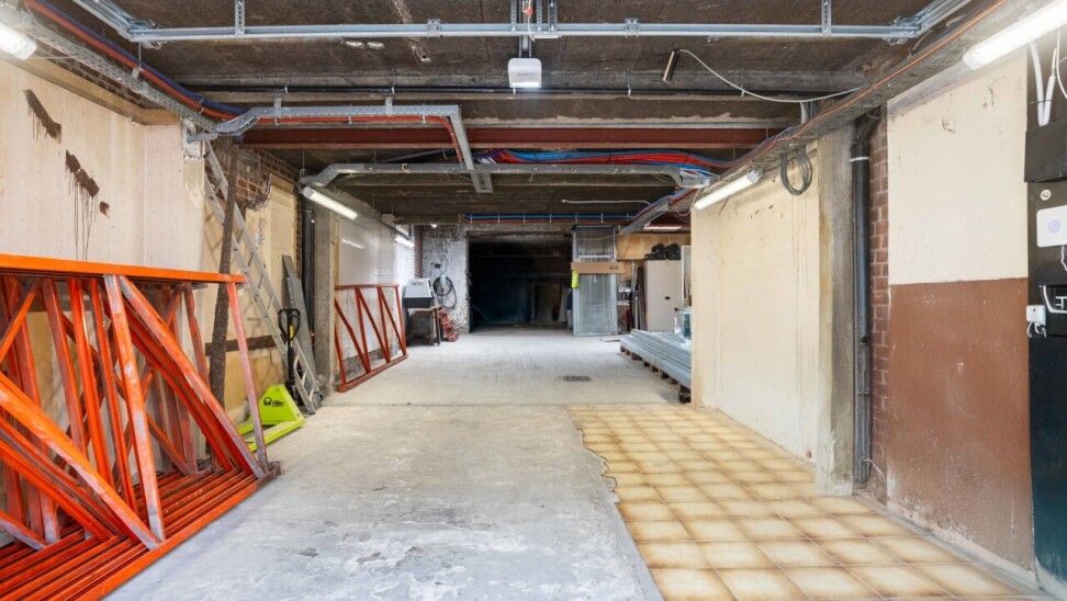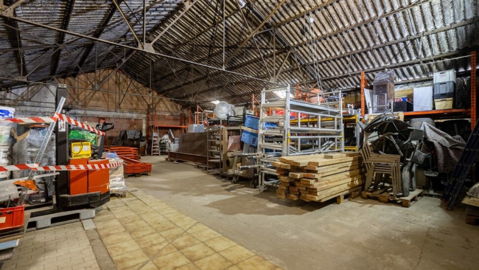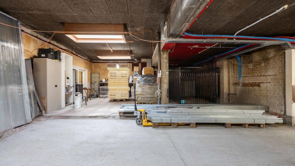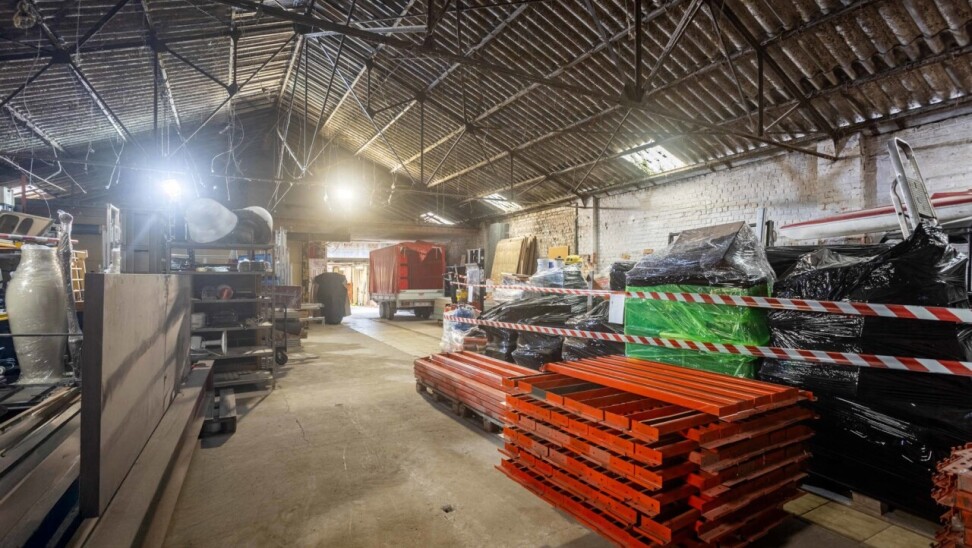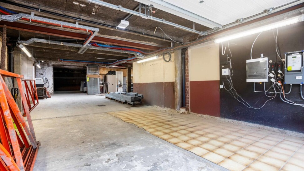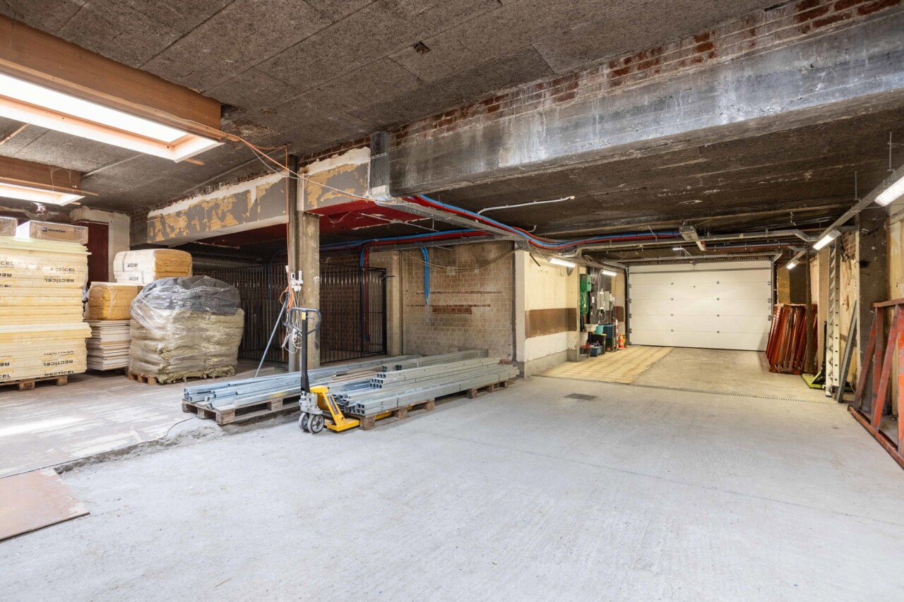 Via de sectionaal poort met een hoogte van 2,55 meter heeft men toegang tot het voorste gedeelte van de opslagruimte. Dit gedeelte omvat een aparte kantoorruimte, technische ruimte en heel wat vrije ruimte, om bijvoorbeeld wagens te parkeren. Daarnaast bevindt zich nog een grote, open loods. Momenteel benut als éen geheel, maar het is perfect mogelijk om hier verschillende compartimenten te voorzien.