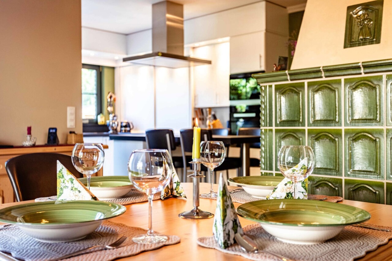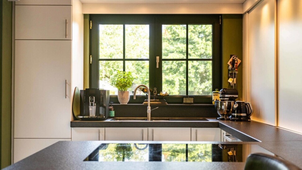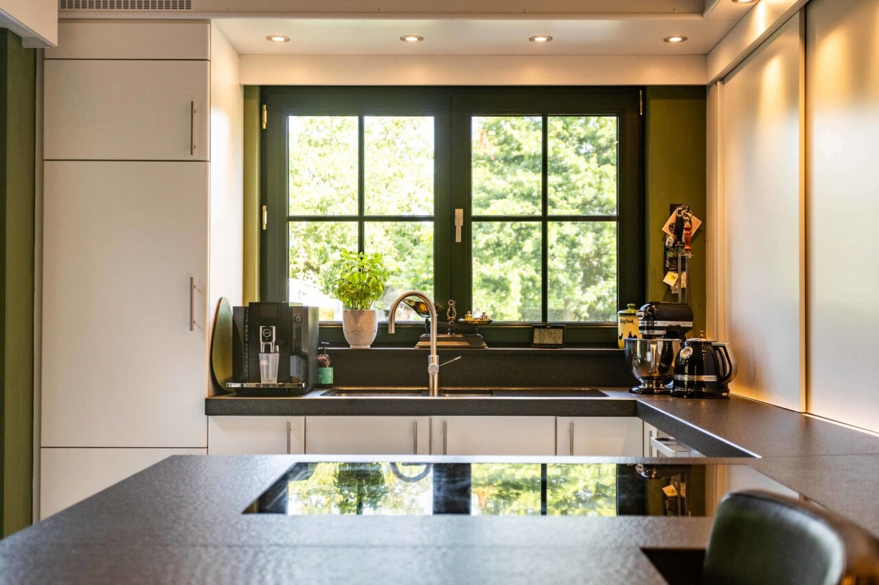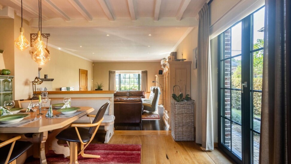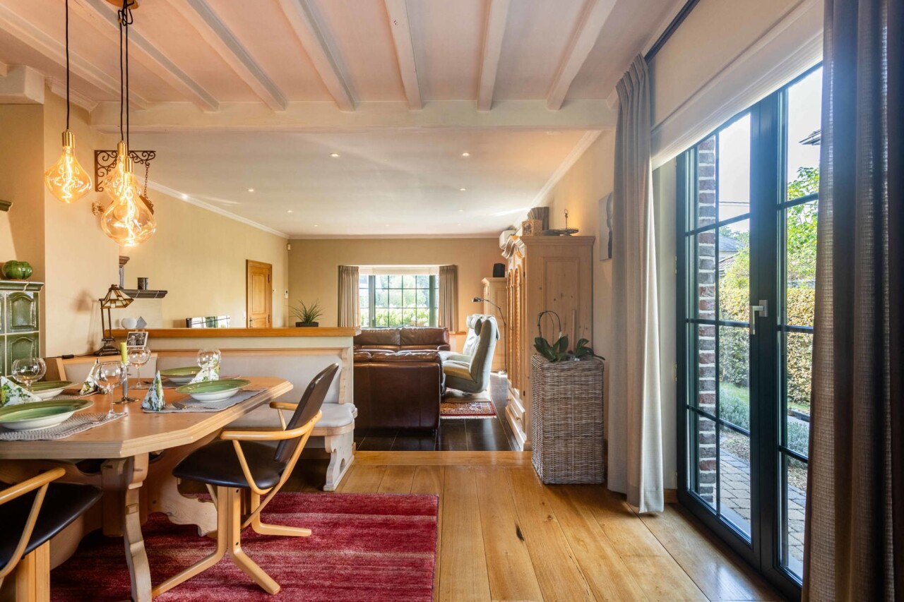 Vanuit de keuke en de eetkamer geniet men van een prachtig zicht op de aangelegde tuin en heeft u toegang tot het gezellig terras.