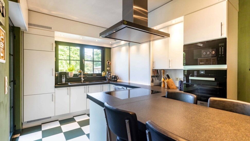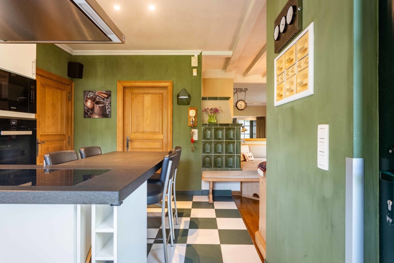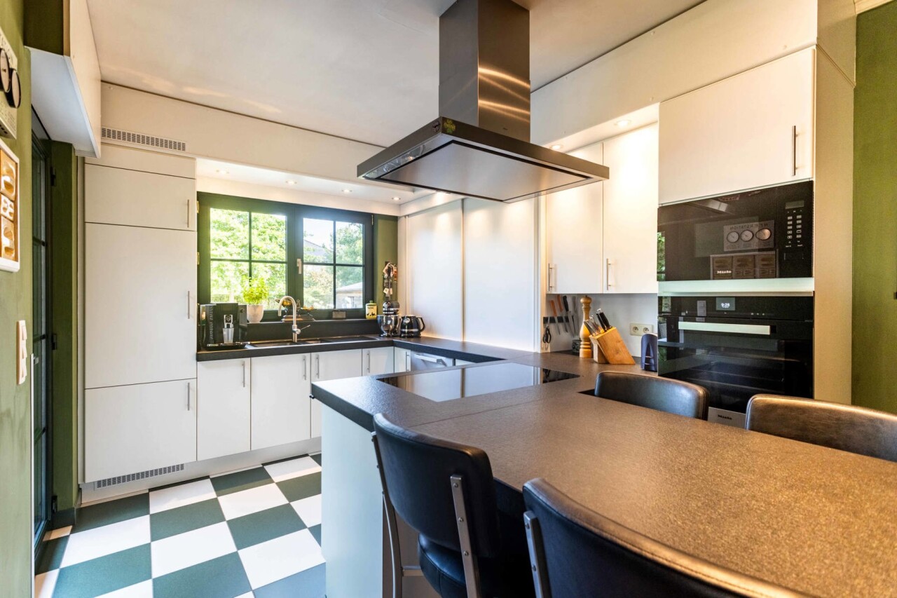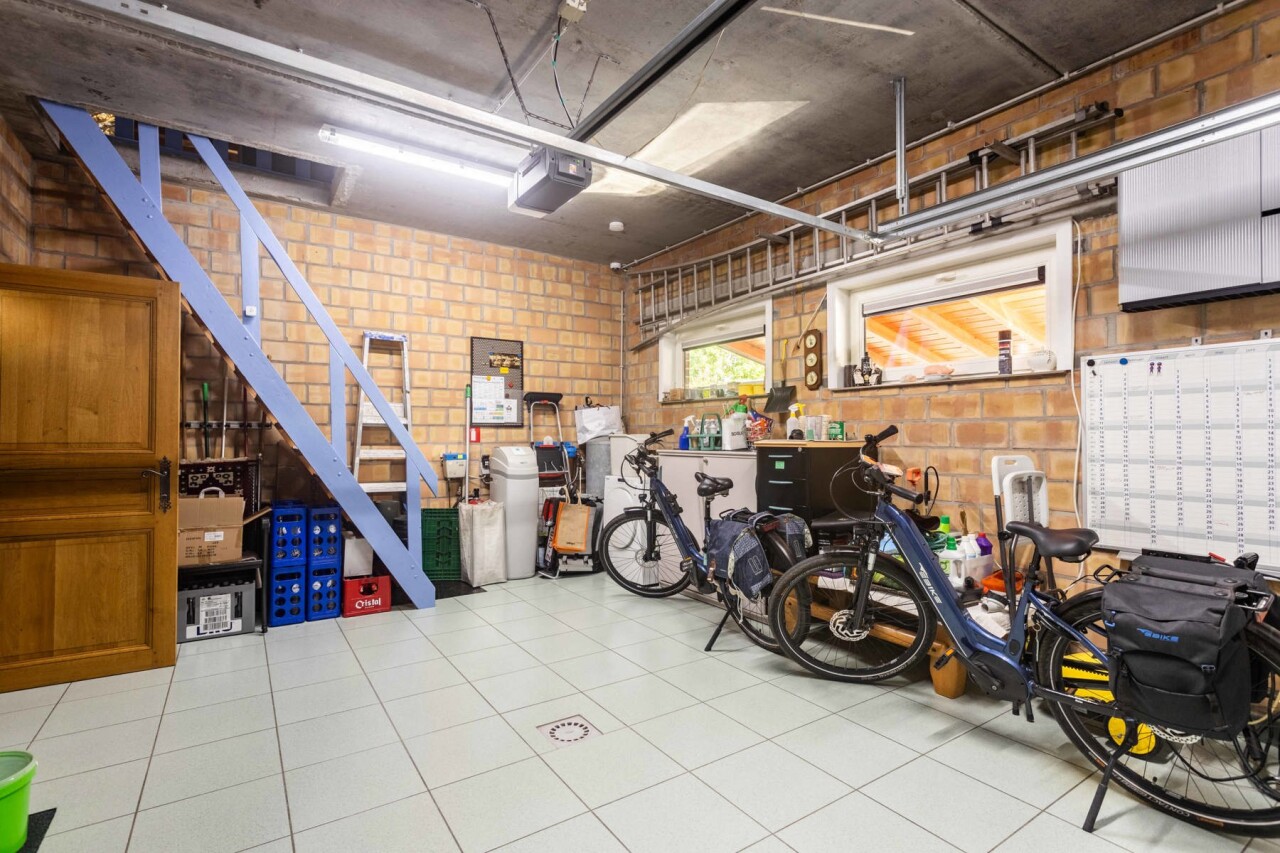 Via de ruime inkomhal, voorzien van een apart gastentoilet en ingebouwde vestiairekast, krijgt u toegang tot zowel de inpandige garage als de lichtrijke woonkamer (32 m²). Deze werd afgewerkt met hoogwaardige blauwe steen, een open haard en een verfijnde afwerking. Aansluitend bevindt zich de gezellige eetkamer met parketvloer en met directe toegang tot de open, volledig uitgeruste keuken (Miele toestellen).