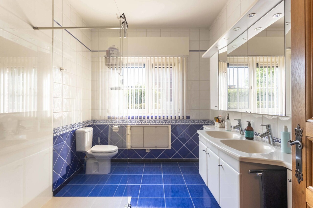 Het gelijkvloers omvat verder twee ruime slaapkamers (13 m² en 18 m²) en een badkamer met inloopdouche, toilet en dubbel lavabomeubel.