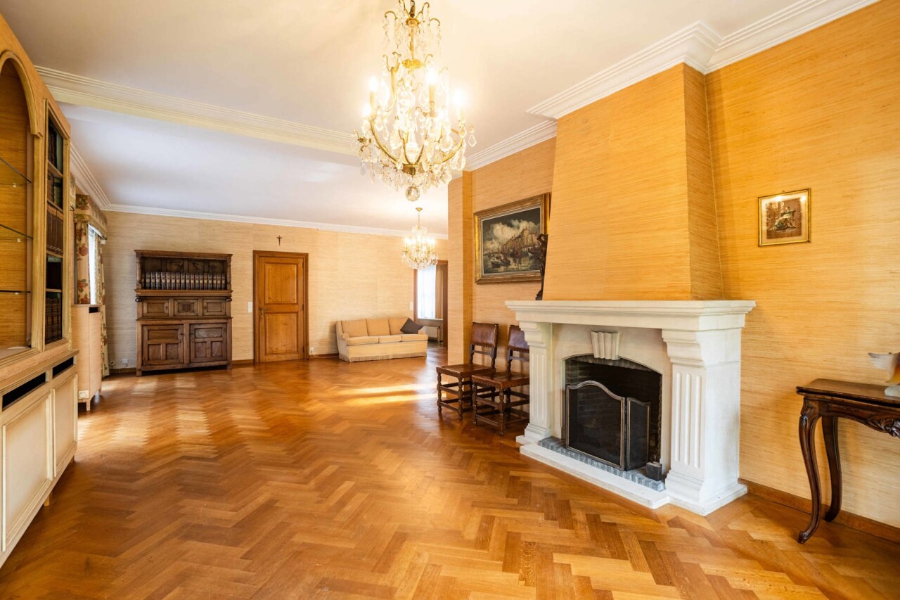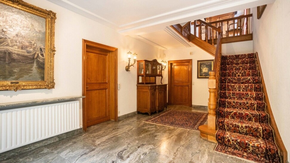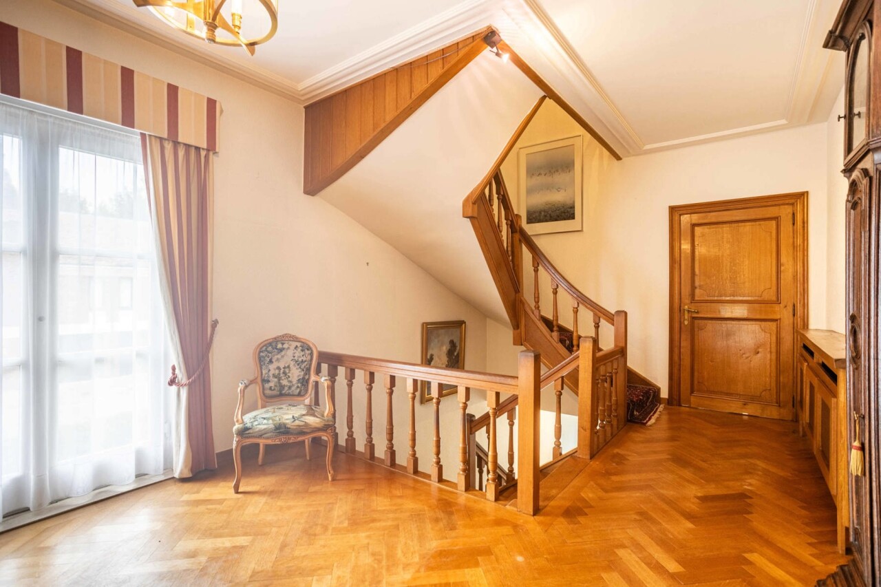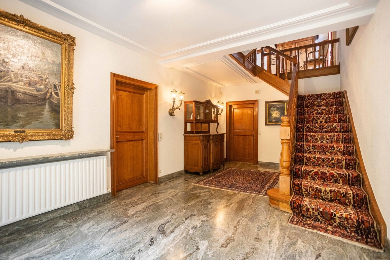 Via de authentieke trappenhal, tevens dé eyecatcher van de woning, bereiken we het eerste verdiep, waar een ruime woonkamer (60 m²), eetkamer, volledig vernieuwde keuken en berging met toiletruimte zich bevinden. Vanuit de woonkamer geniet u van een prachtig uitzicht over de perfect onderhouden tuin met zuidwest oriëntatie. Deze grote tuinzone biedt vele mogelijkheden en kan (onder voorbehoud) bebouwd worden.