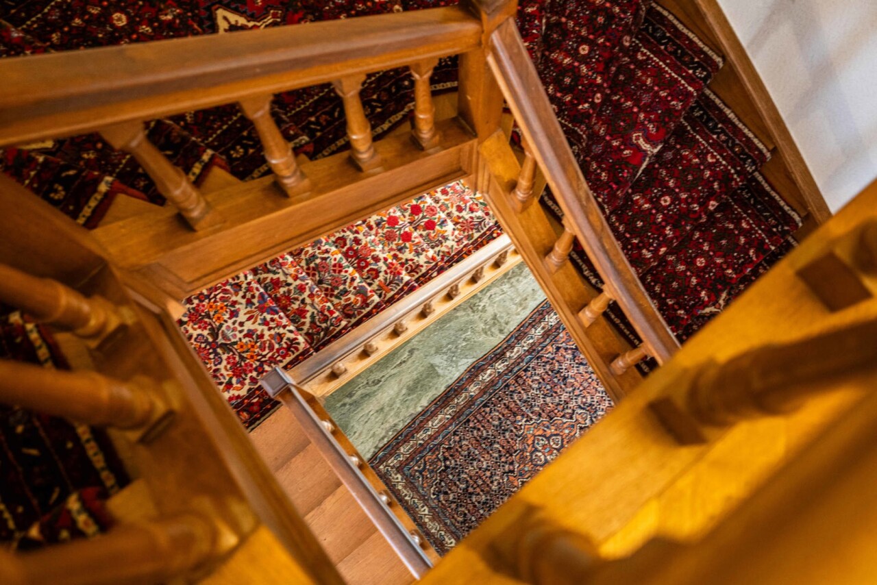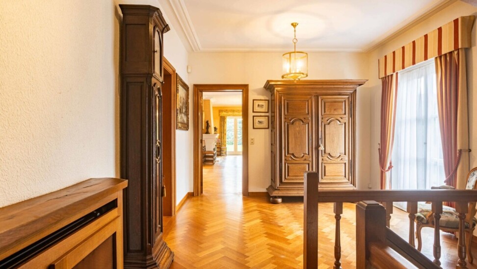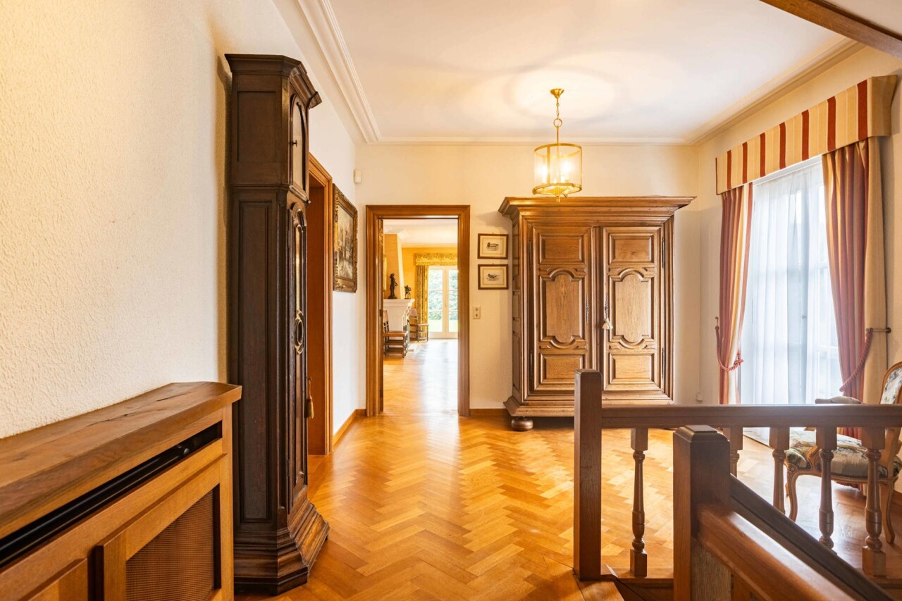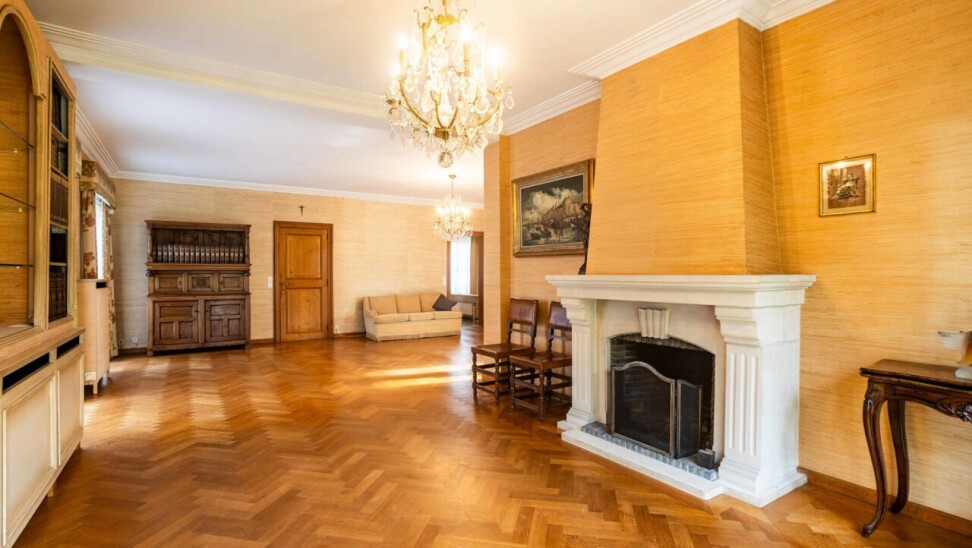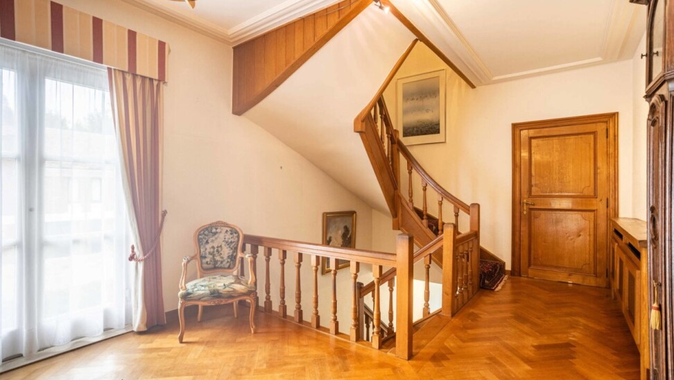 Via de authentieke trappenhal, tevens dé eyecatcher van de woning, bereiken we het eerste verdiep, waar een ruime woonkamer (60 m²), eetkamer, volledig vernieuwde keuken en berging met toiletruimte zich bevinden. Vanuit de woonkamer geniet u van een prachtig uitzicht over de perfect onderhouden tuin met zuidwest oriëntatie. Deze grote tuinzone biedt vele mogelijkheden en kan (onder voorbehoud) bebouwd worden.